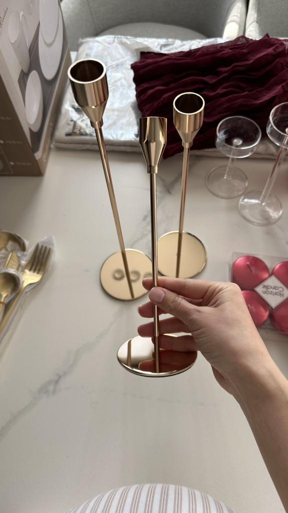 The candlesticks come as a set of 3, which I find super practical. A great value for money offer. The candlesticks are really chic. The delivery was relatively quick and they were packaged very well. Would I buy again