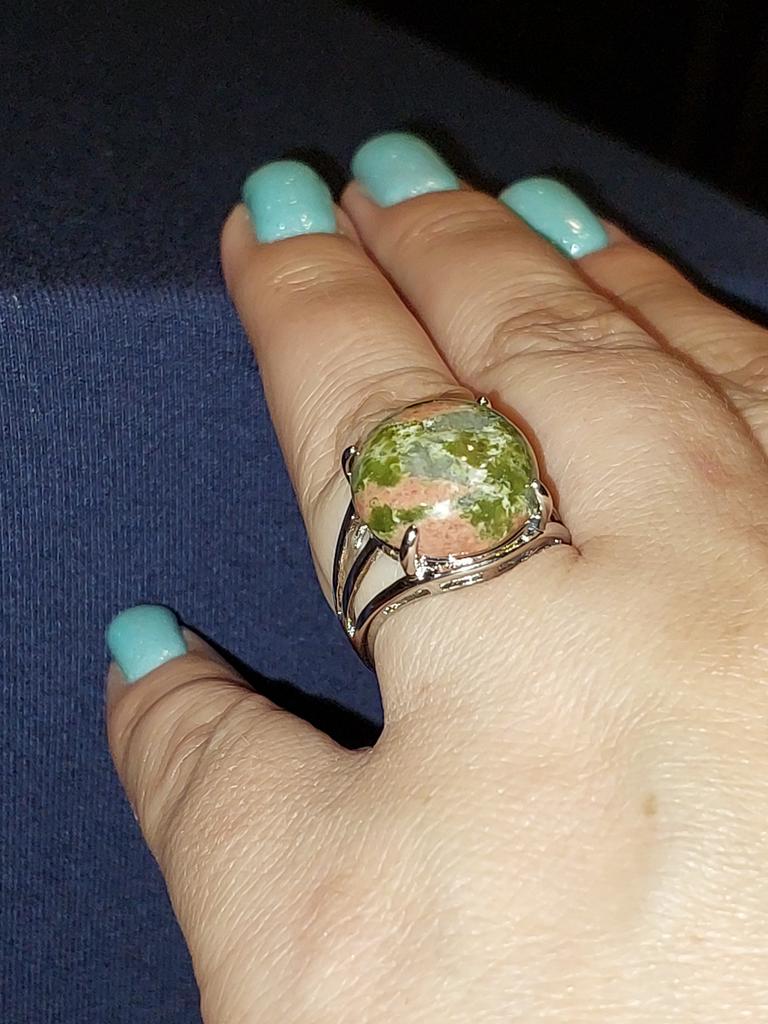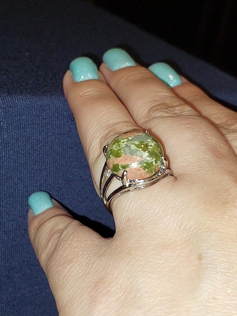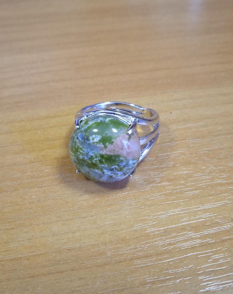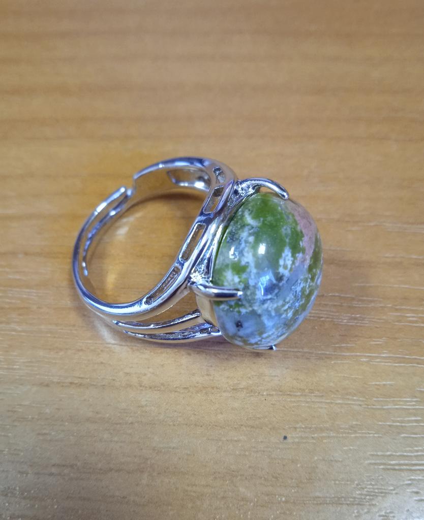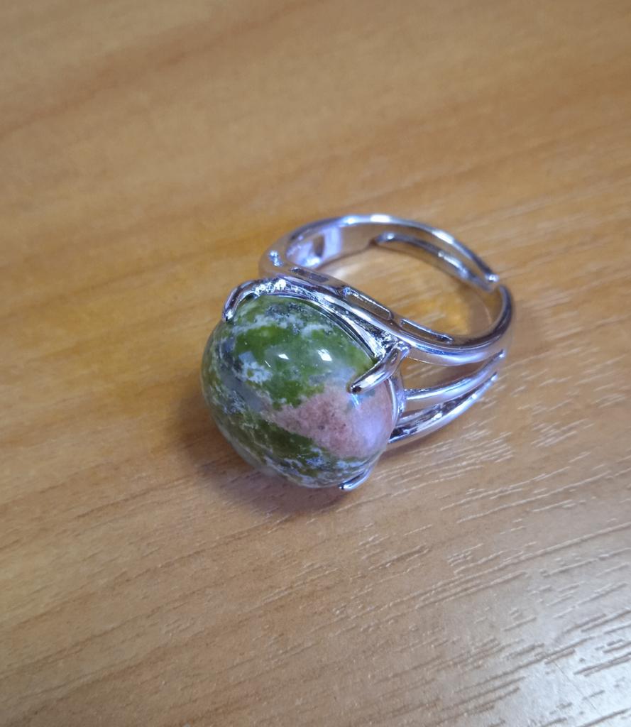 The stone is not unakite!!! At least it doesn't have the characteristic pink inclusions. The stone is not fixed to the base, it spins under the horns. I hope it doesn't pop out.. The photo shows a comparison of the stone from the ring with a real unakite. Similar in tone, but still different.