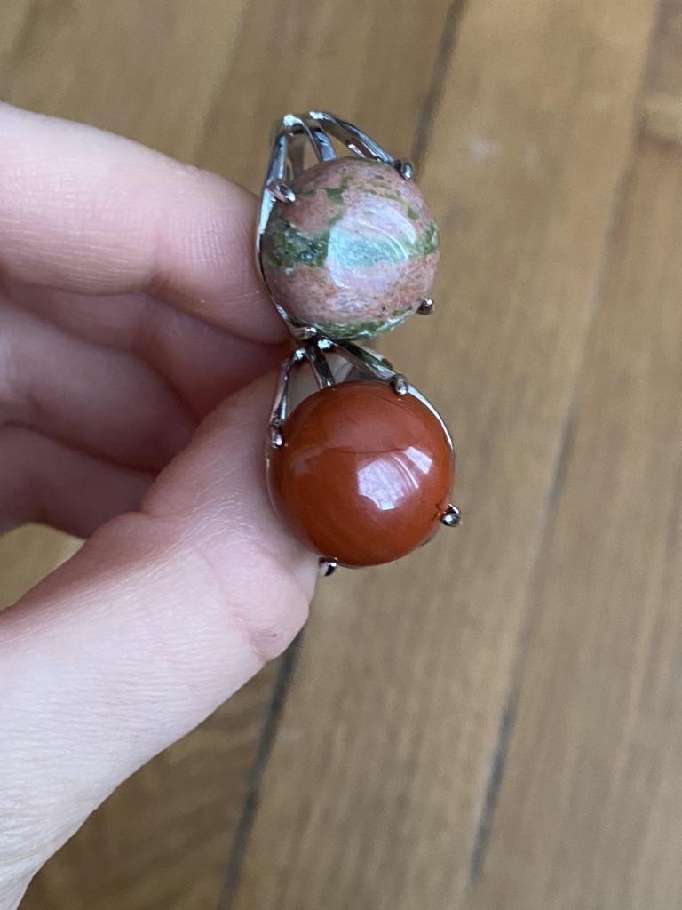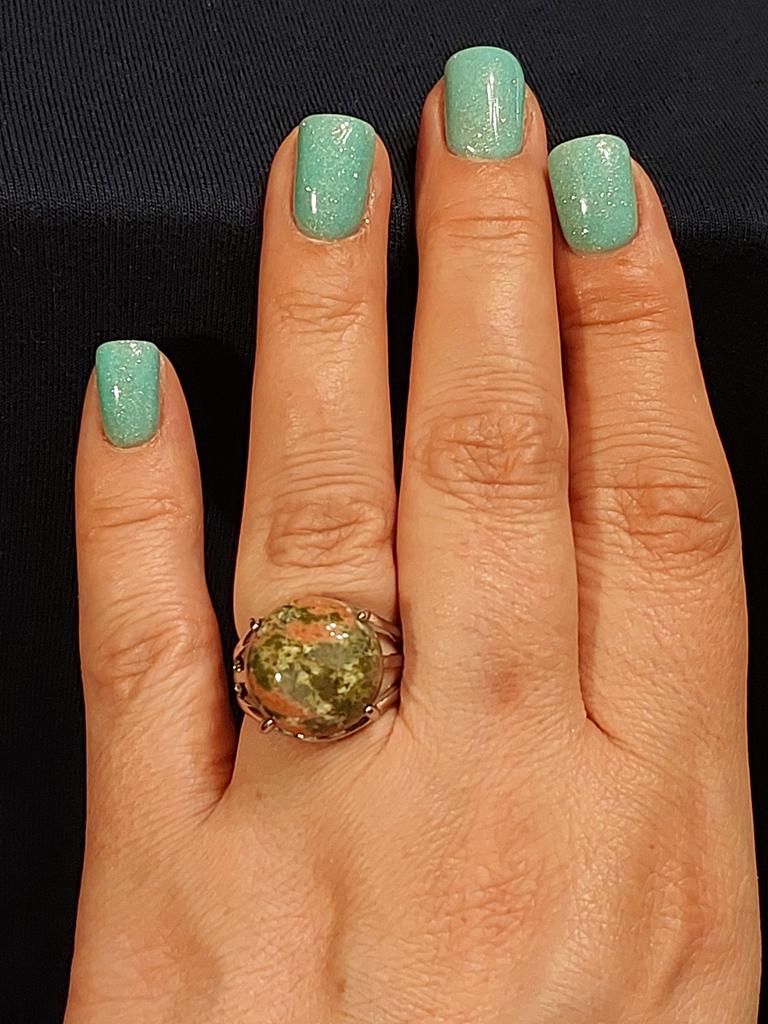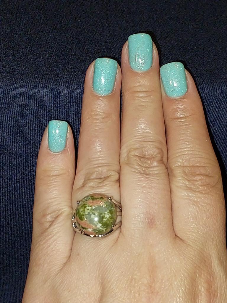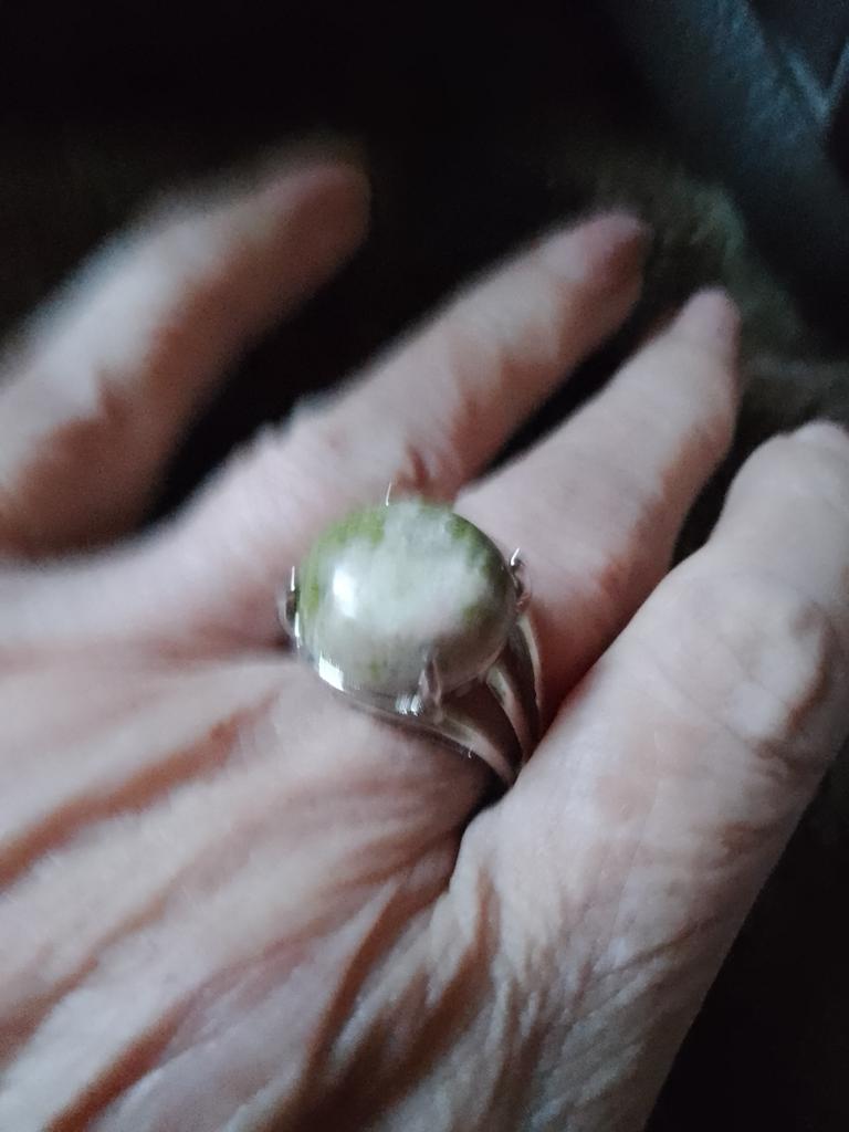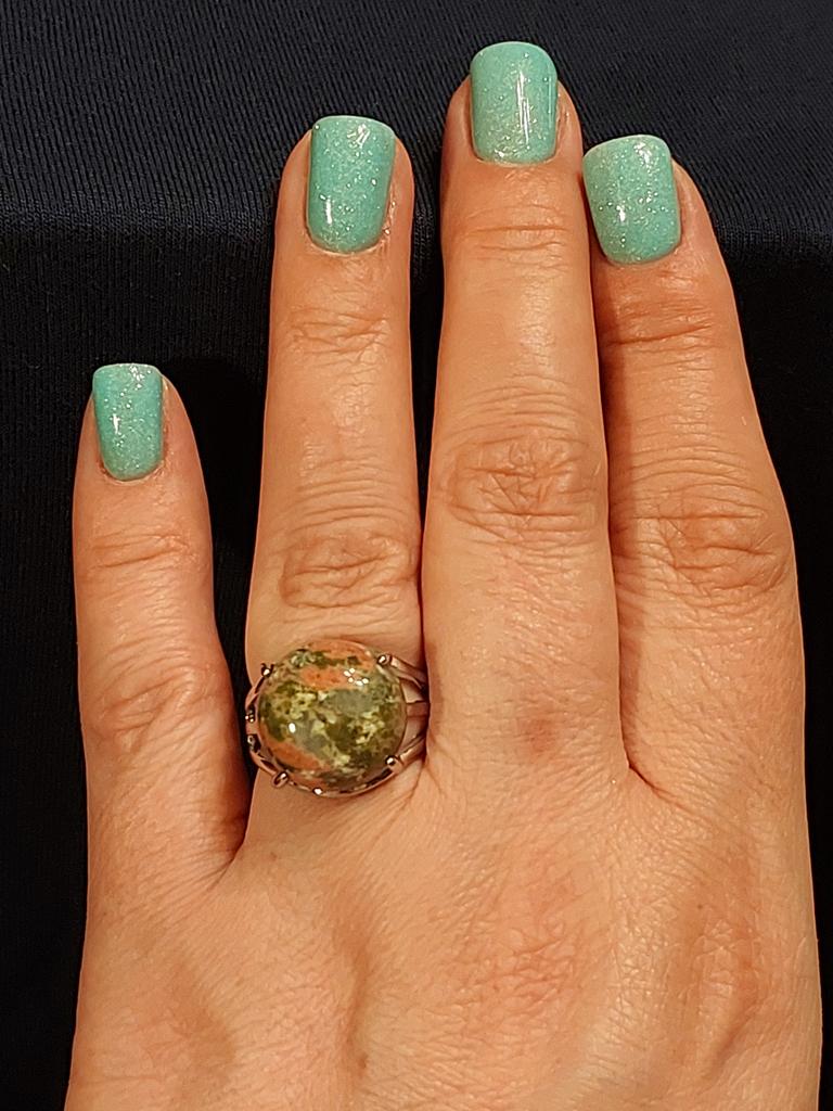 The stone is not unakite!!! At least it doesn't have the characteristic pink inclusions. The stone is not fixed to the base, it spins under the horns. I hope it doesn't pop out.. The photo shows a comparison of the stone from the ring with a real unakite. Similar in tone, but still different.