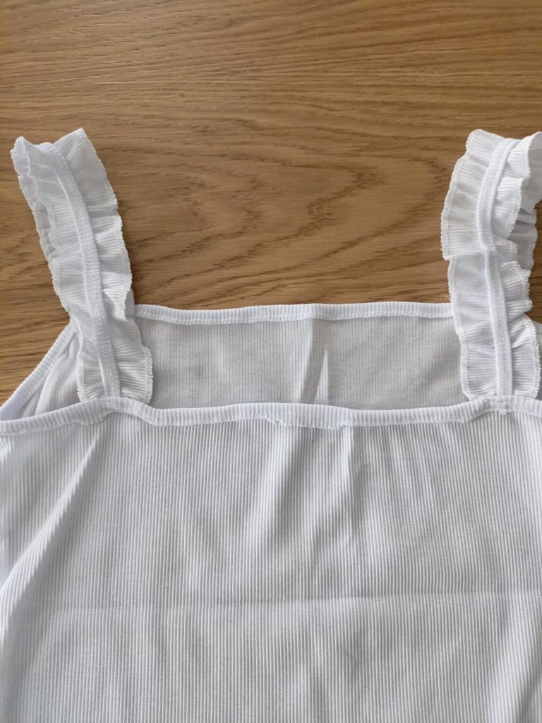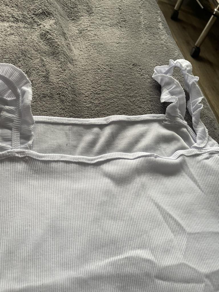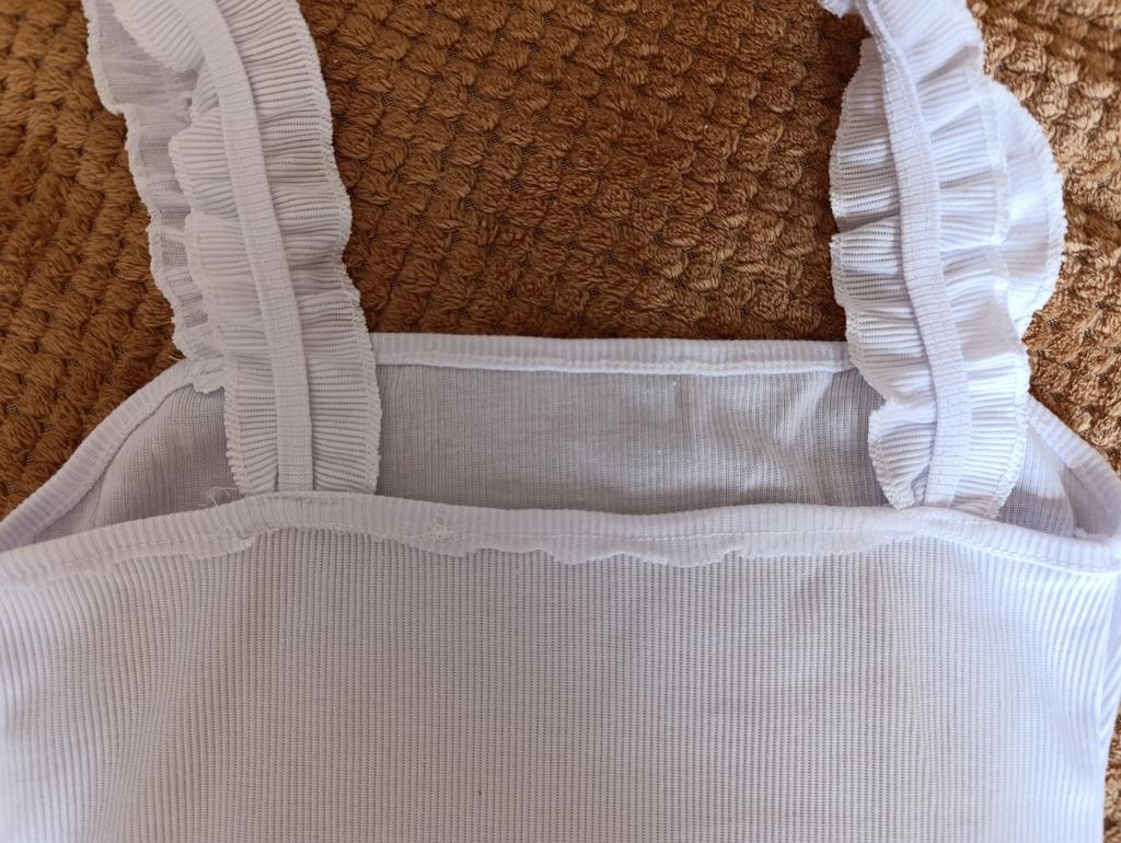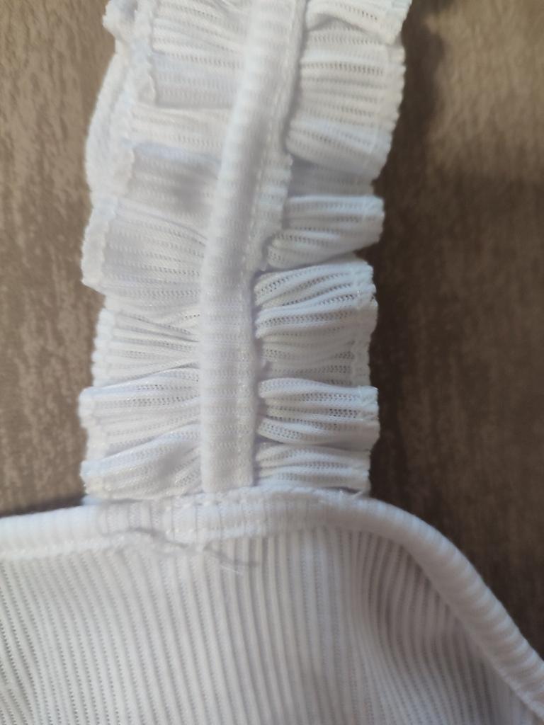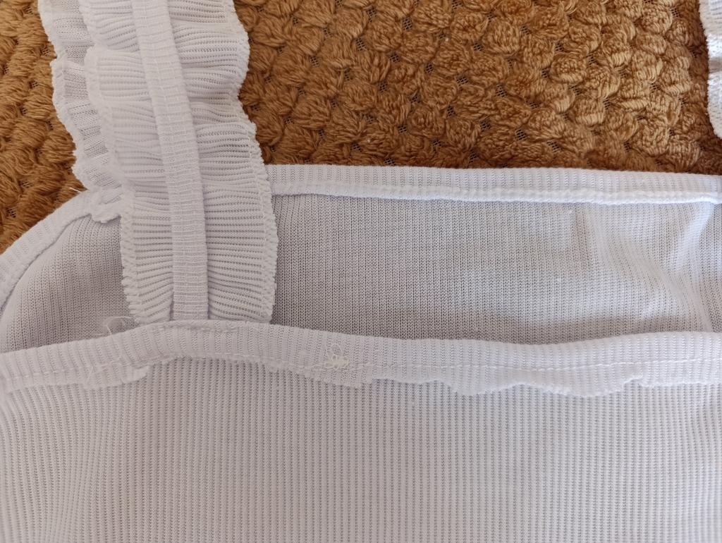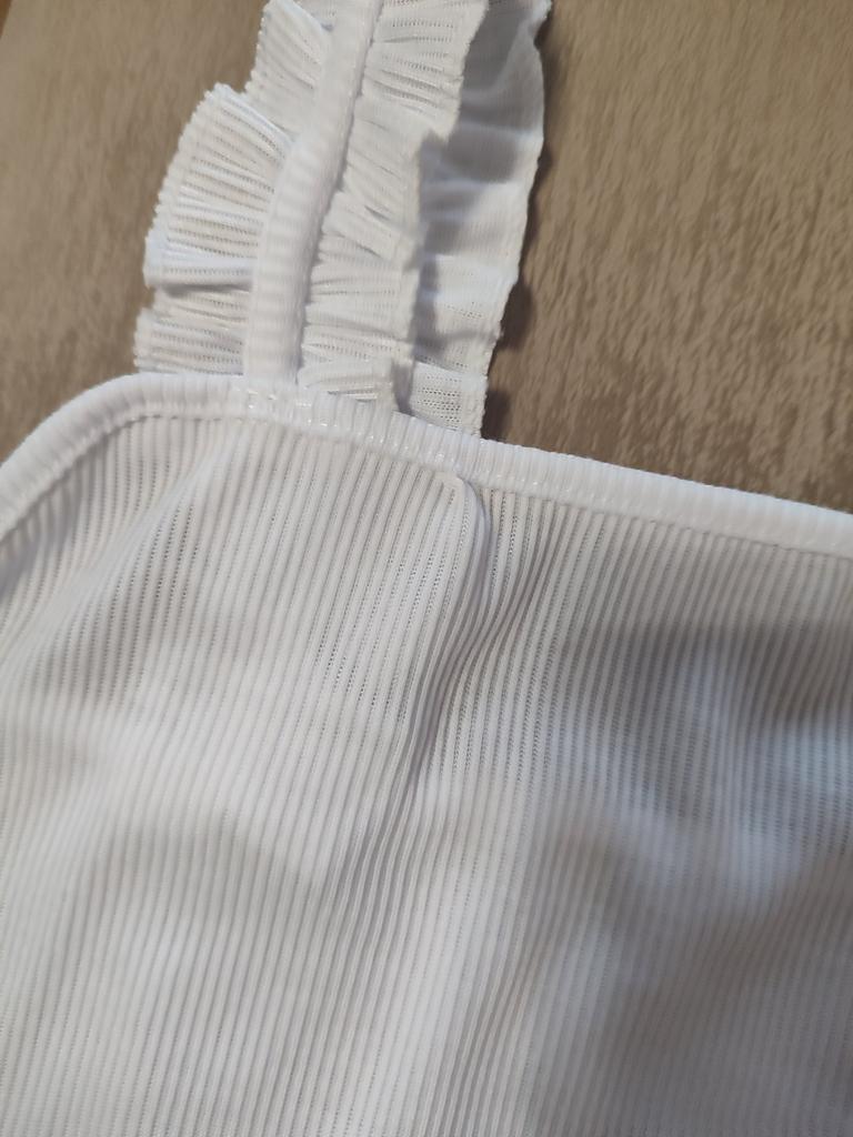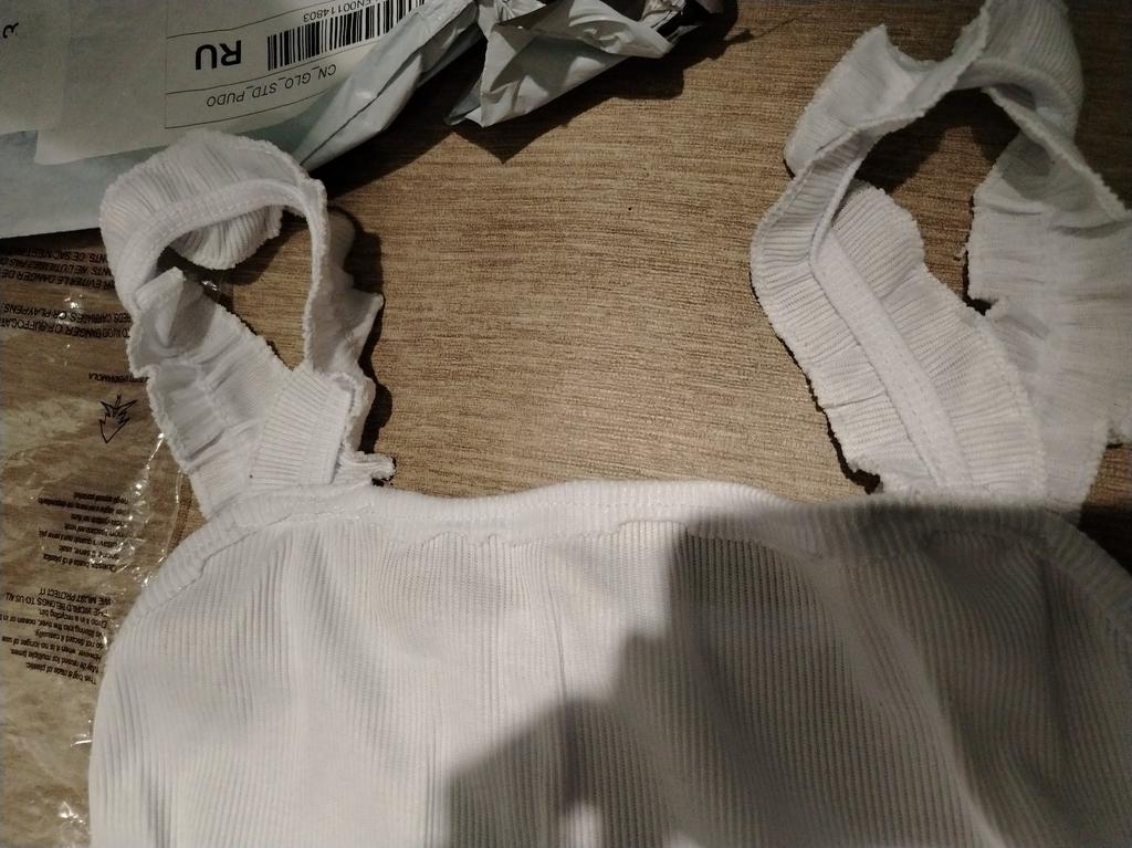 The top is completely different from the photo. The straps are terrible, thin, and threads are sticking out everywhere. Plus, the white top has some stains. Terrible product