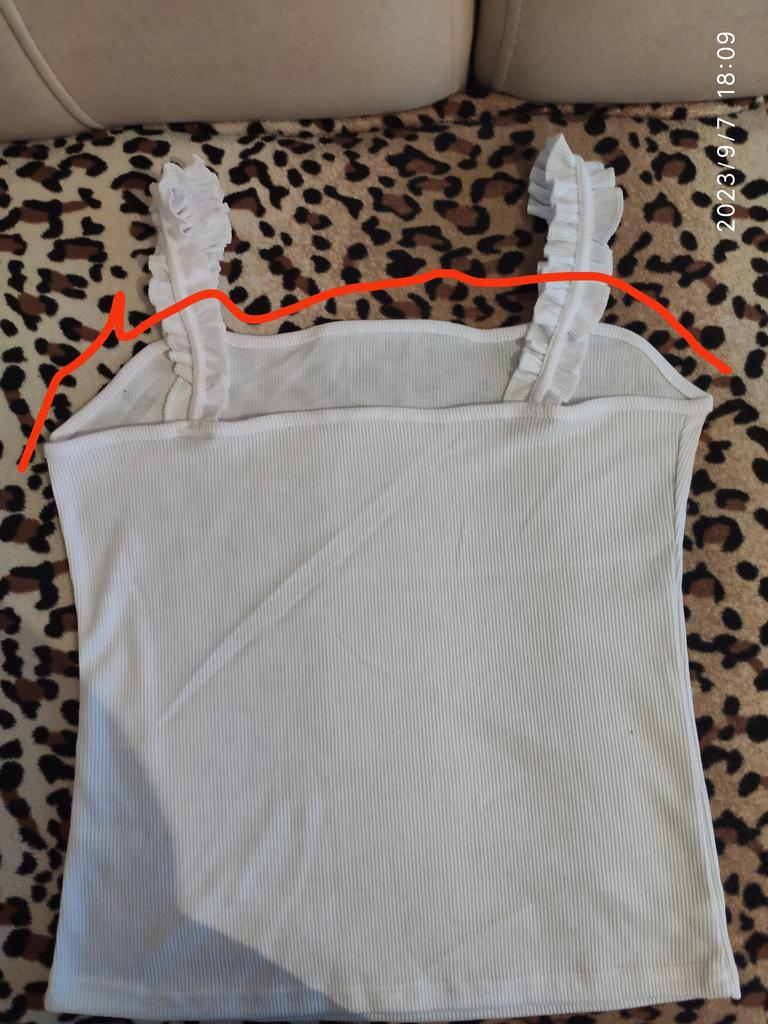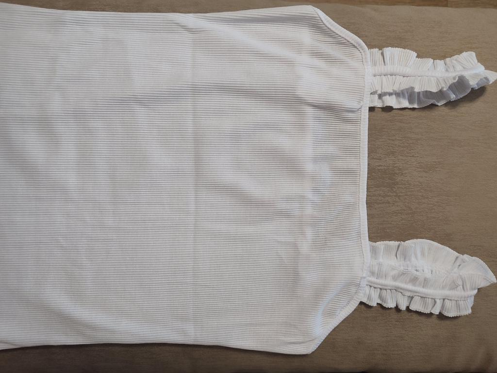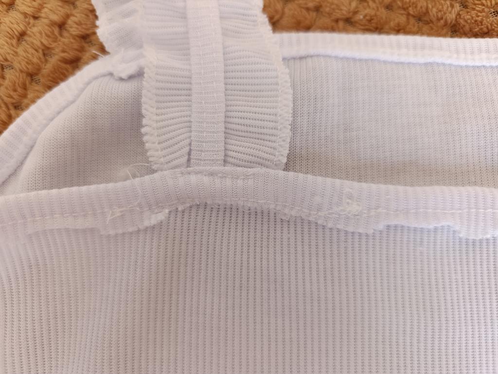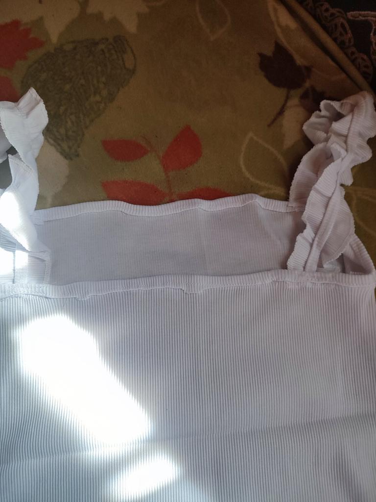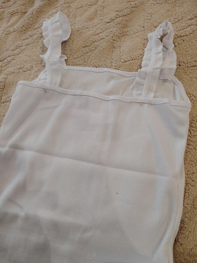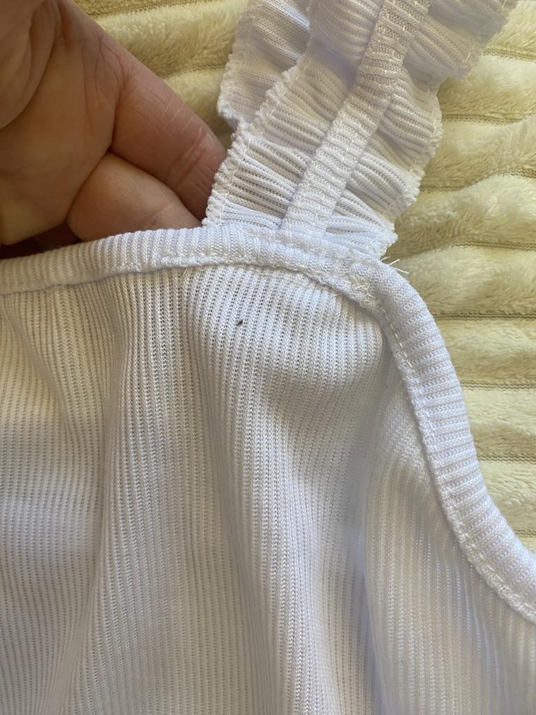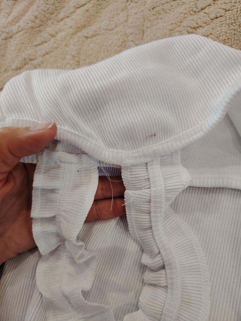 The top is completely different from the photo. The straps are terrible, thin, and threads are sticking out everywhere. Plus, the white top has some stains. Terrible product