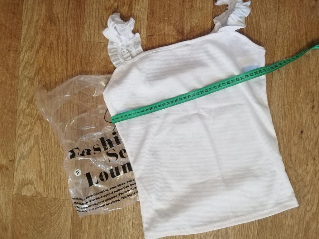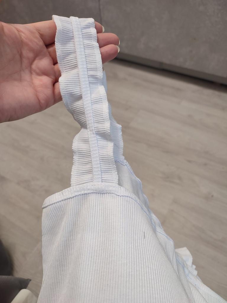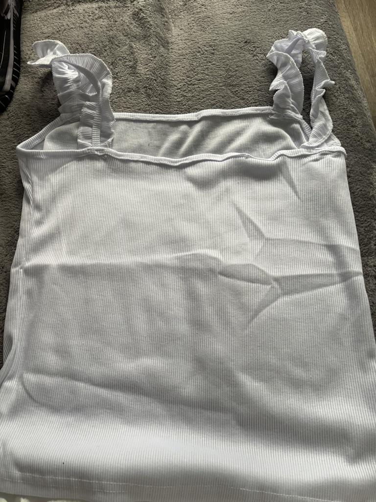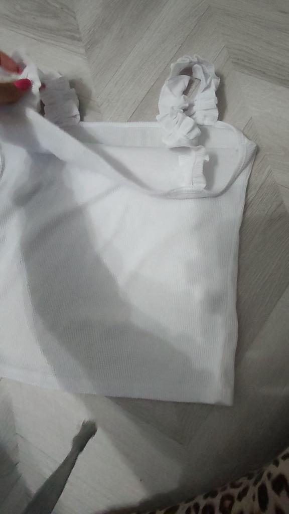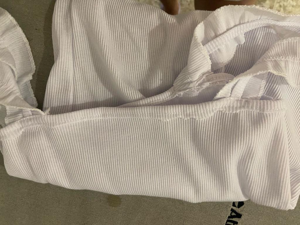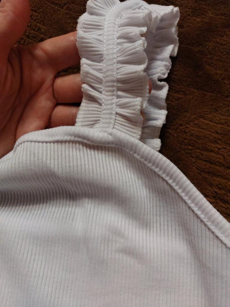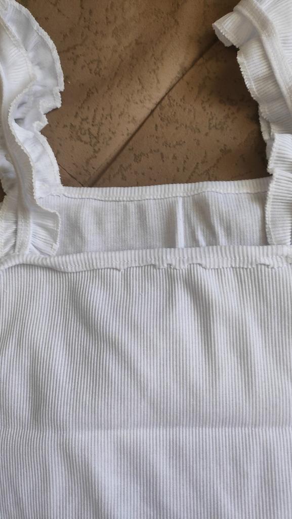 The top is completely different from the photo. The straps are terrible, thin, and threads are sticking out everywhere. Plus, the white top has some stains. Terrible product