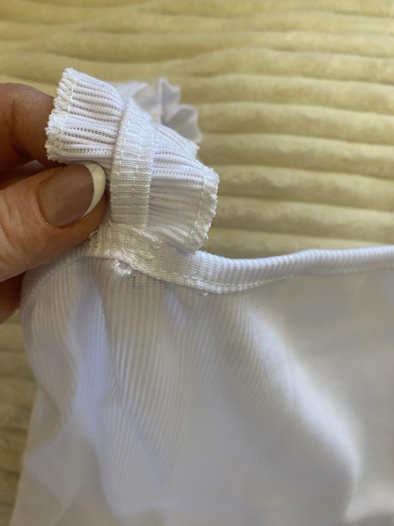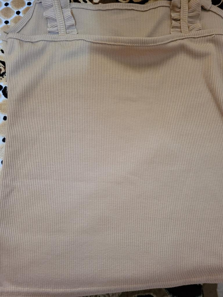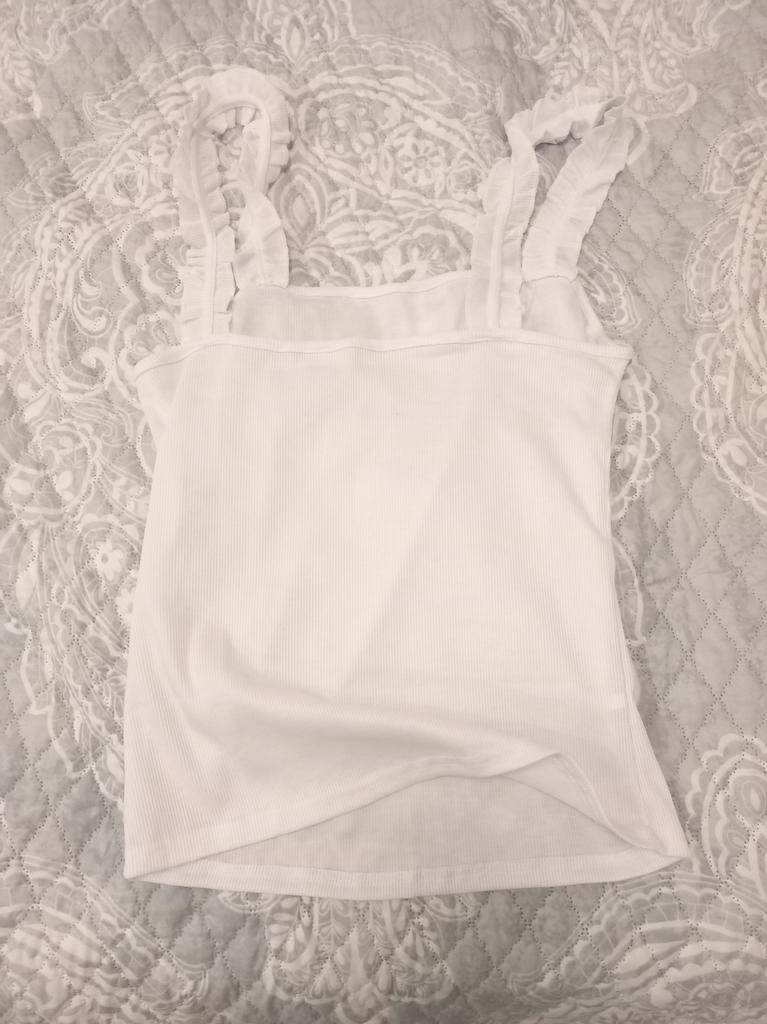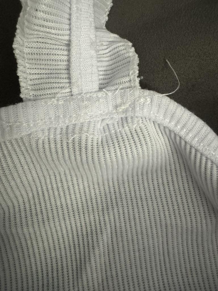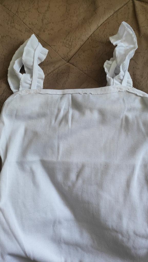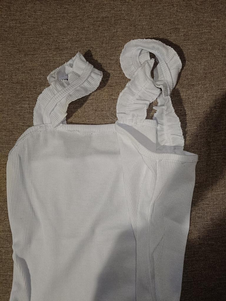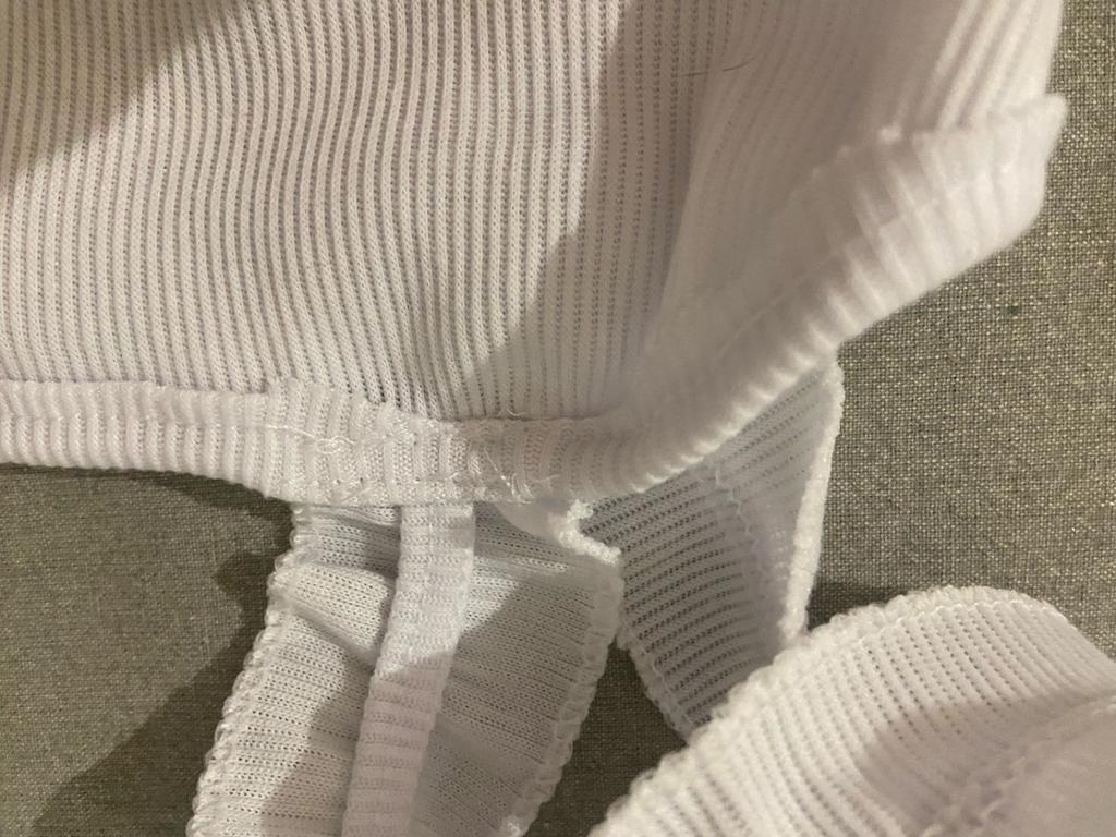 The top is completely different from the photo. The straps are terrible, thin, and threads are sticking out everywhere. Plus, the white top has some stains. Terrible product