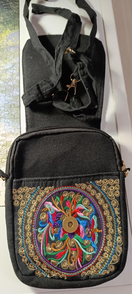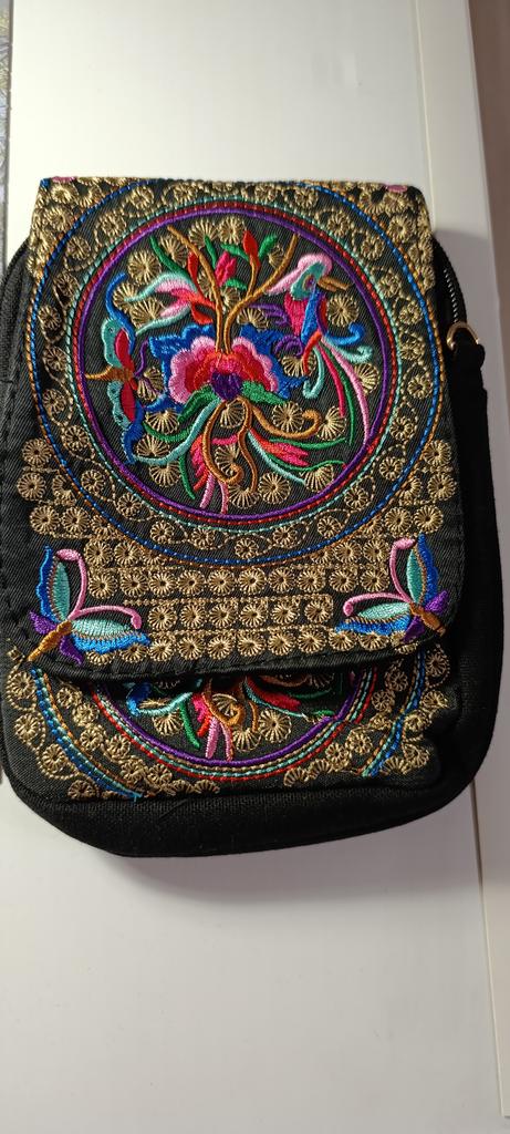 Suitable size to put a phone and other small items. Beautiful embroidery. Two compartments and a small pocket.