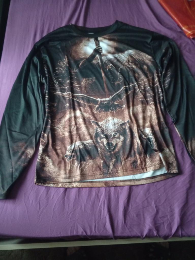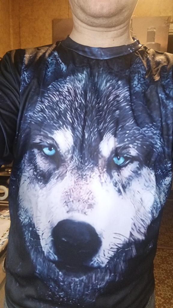 The T-shirt fits the grandson perfectly, the wolf just lives on his chest Thank you