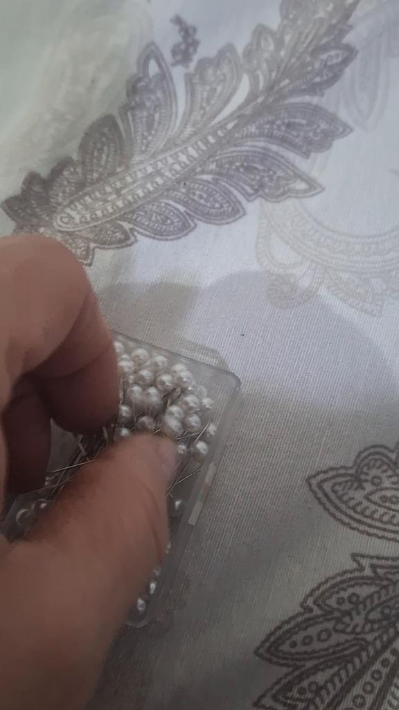 Safety pins with pearl balls, were delivered in a box. The needle is 4 cm. Thank you to the seller.
