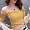 Women's Slash Neck Solid Short Sleeve Knitted Ruffles T-Shirt