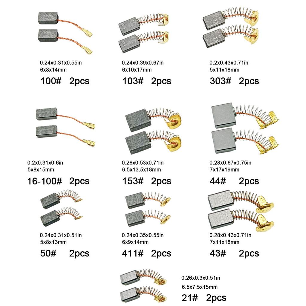 *20Pcs 10 sizes carbon brushes, each size 2Pcs(7x17x19mm,5x11x18mm,6.5x7.5x13mm,6.5x13.5x18mm,6x10x17mm,6x9x14mm,7x11x18mm,6x8x14mm,5x8x13mm 5x8x15mm).