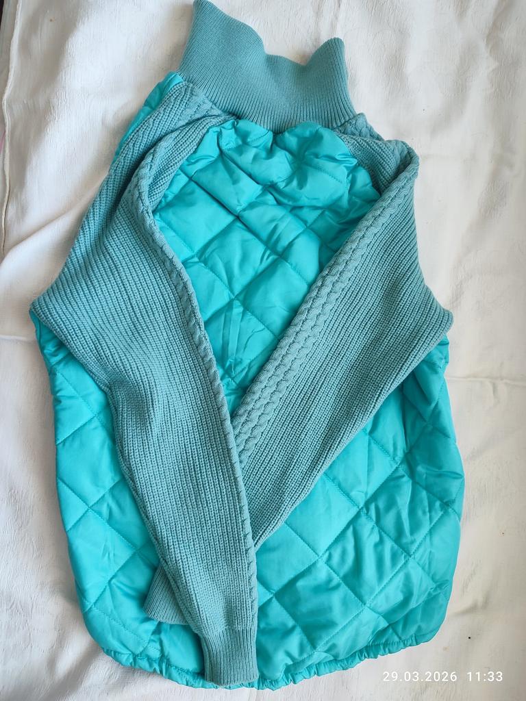 The jacket looks very cute. Due to the knitted sleeves, it fits well on the chest.