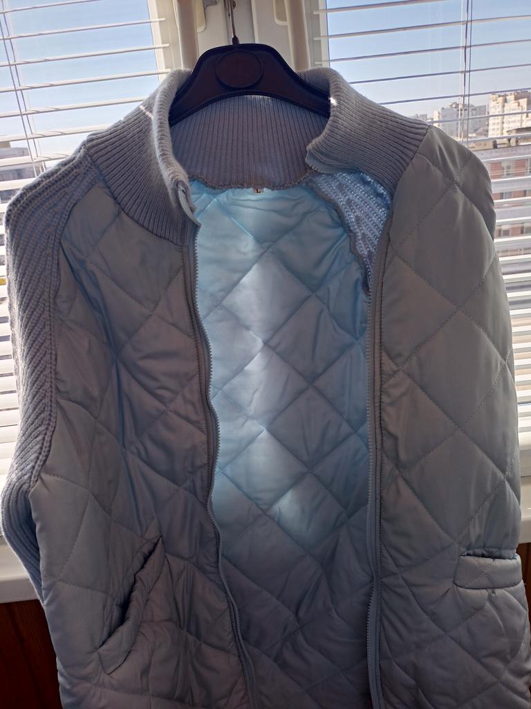 Didn't like the jacket. It's green. The color combination looks completely different in the photo. The knitted part looks beautiful, the color is nice, like in the photo. But the part of the jacket made of raincoat fabric is a completely different color, light green, but so bright that it's jarring to the eye. The size is true to the size chart. L fit size 54-56. The price tag for such an item is greatly inflated. Bought it for 2430. There was no gift in the package.