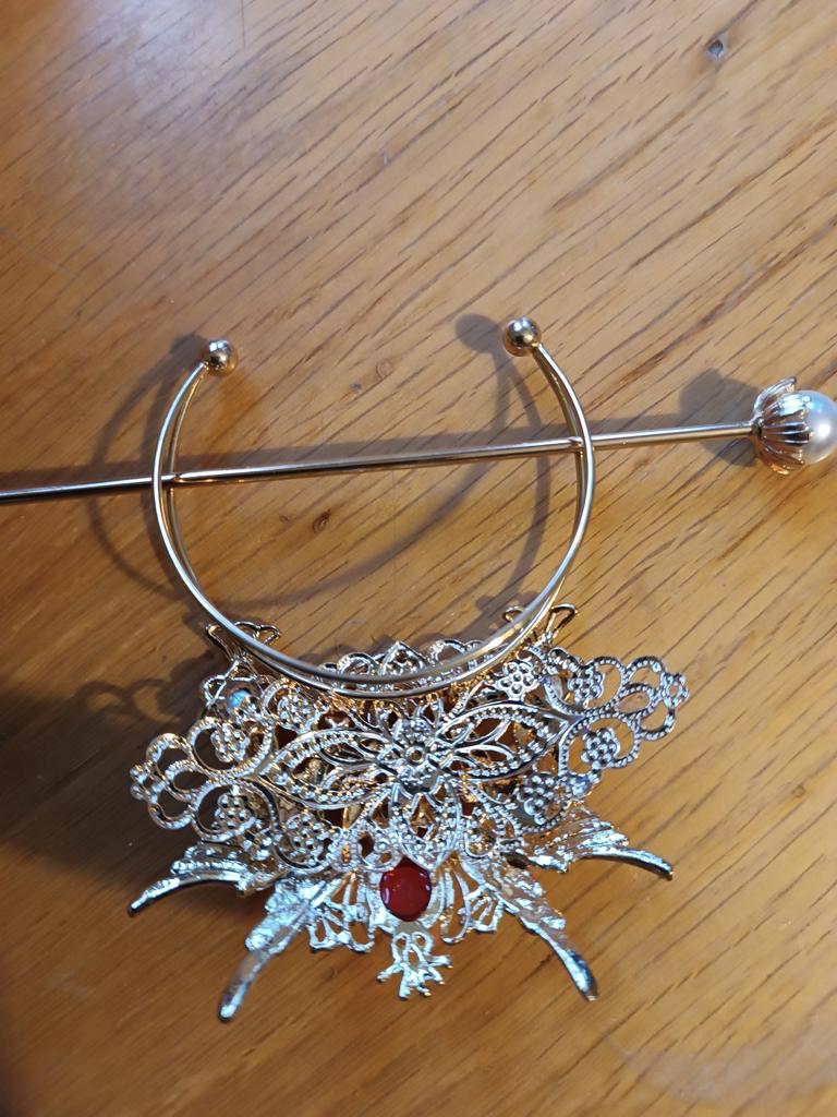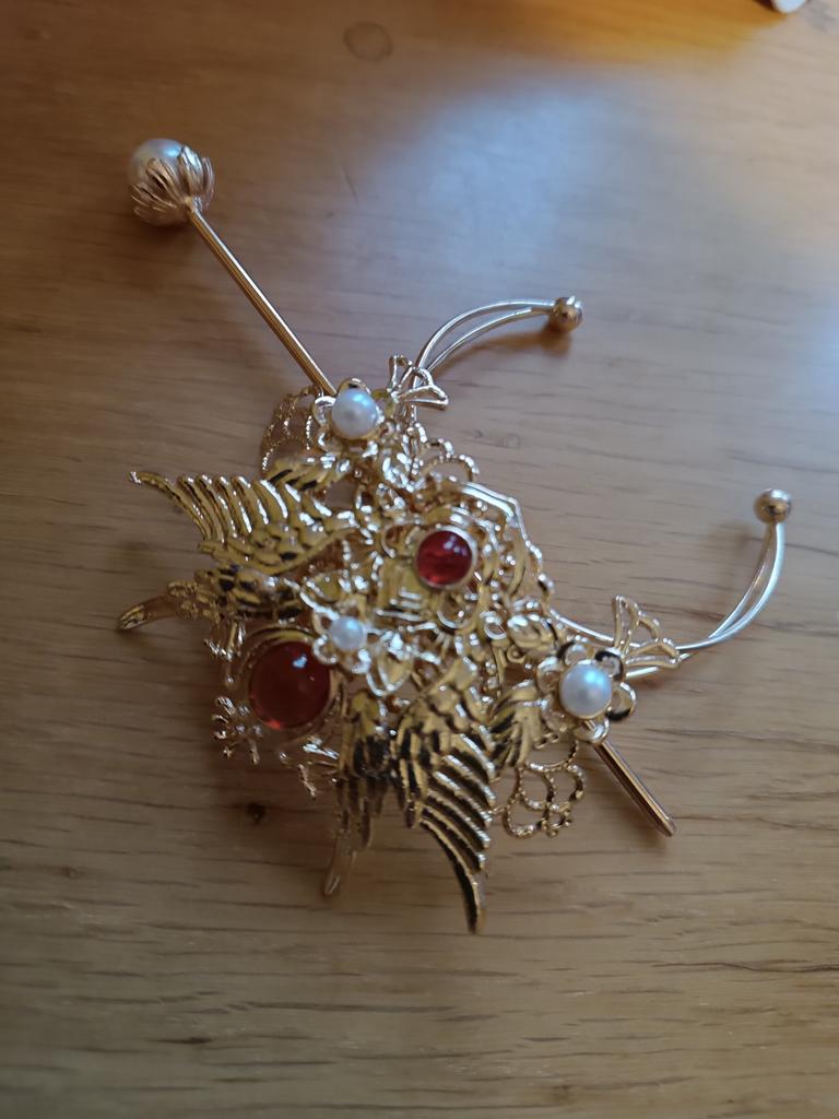 It could be a beautiful hair ornament, but the material is of poor quality, very thin, it was assembled with wire, which broke. One wing of the ornament is completely bent and half broken.