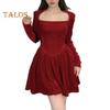 Women Dress Square Neck Pleated A-line Long Sleeves Pleated Slim Waist Velvet Mini Dress Prom Banquet Party Short Dress Fall Spring Princess Dress
