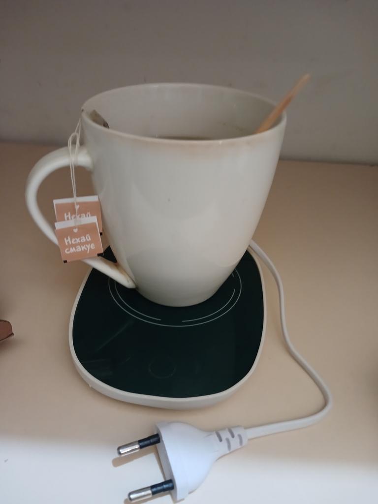 A wonderful thing. Heats up strongly and quickly. I burned my hand a little because, stupidly, I thought "Well, it's a Chinese hot water bottle, how hot can it be, pfft!" Well, it can. It doesn't heat the ceramic cup so much, but I put a folded handkerchief under the plastic container because I'm concerned that the plastic might overheat and deform if I put the container with food directly on the hot water bottle. On the other hand, today I ate hot homemade food at work for the first time. Other advantages - the power button is at the bottom, it activates under the weight of the placed item. When a cup or tray is placed on it, the warmer heats up. When removed, the warmer turns off. It also cools down quite quickly.. Of the minuses - it smells quite strongly of plastic and moreover I'm not sure that this heater will last long and won't try to take the socket with it when it decides that it's time to die. But we'll cross that bridge when we come to it. For now, I'm satisfied with everything.