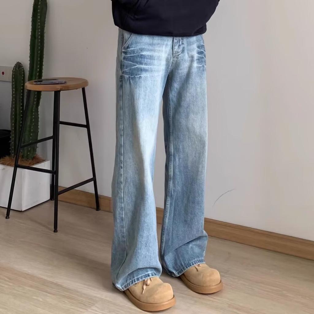 High Street Denim Pants For Men, Retro Distressed, Loose Straight Leg Pants, Wide Leg Sports Pants, Trendy