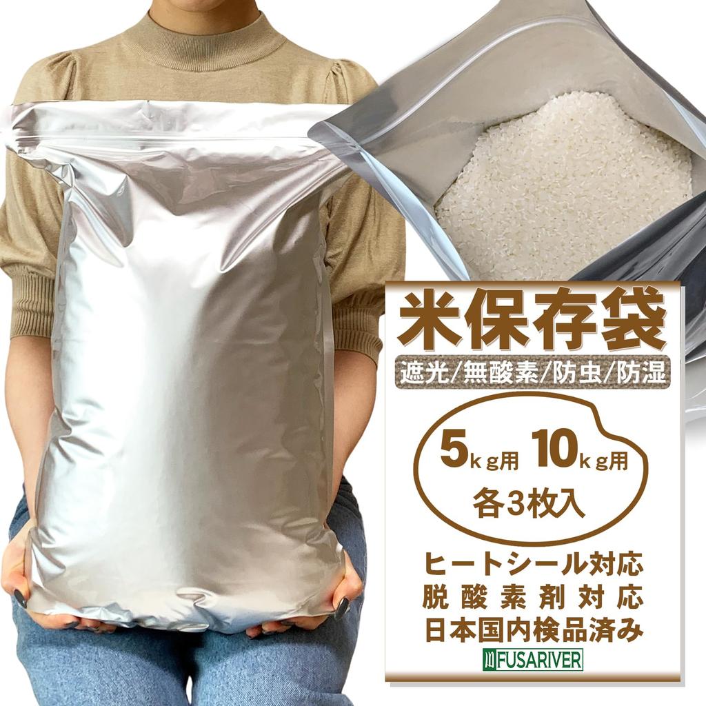 Product name: FUSARIVER rice storage bag for 5kg & 10kg Material: Aluminum/PET/PE Size: 30 x 42cm for 5kg, 35 x 50cm for 10kg Quantity: 3 pieces of each type