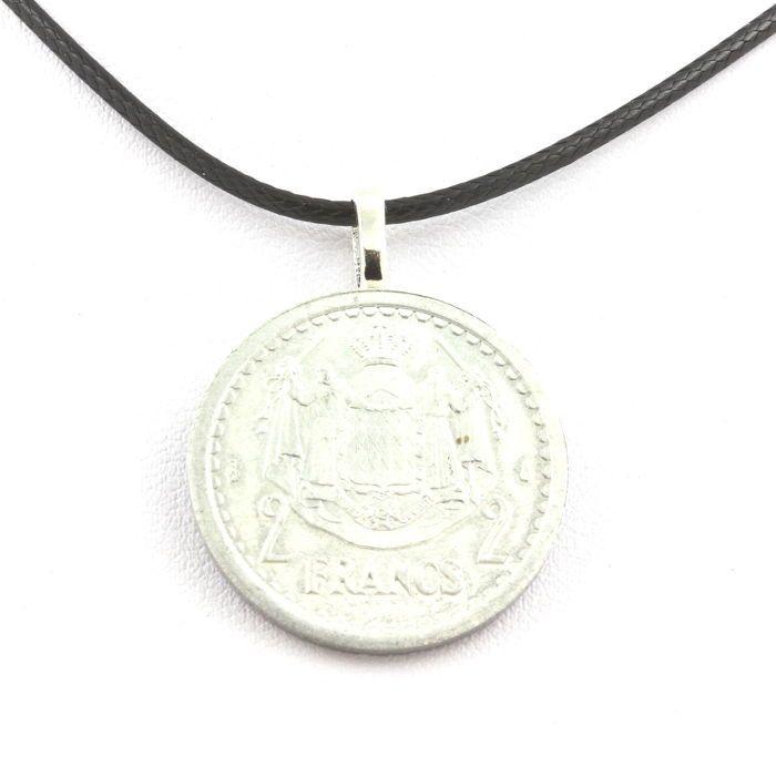 Pierres et Minéraux. Collier pièce de monnaie Monaco 2 francs - Louis II essai aluminium. Cordon noir.