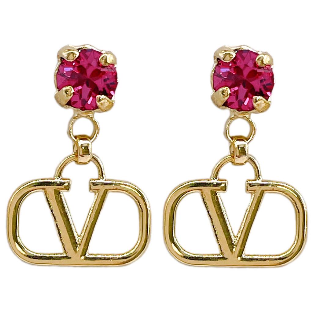 Valentino V Logo Signature Metal Crystal Stud Earrings 5W2J0H29 YCW 7CR Gold/Fuchsia [Item]