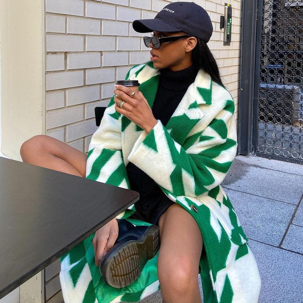 Women's Colour Blocking Time Long Sleeve Lapel Jacket Printed Tweed Coat