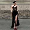 Sexy Skew-collar Sling Dress Women Lace Patchwork Backless Sleeveless Slim Long Dresses 2025 New Lady Ruffle Split Party Dress