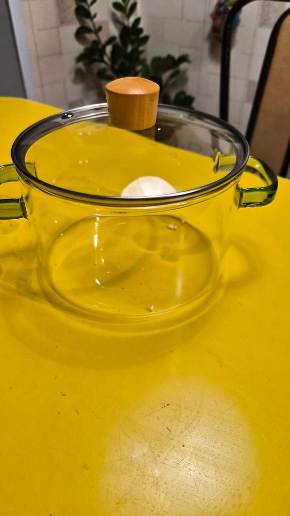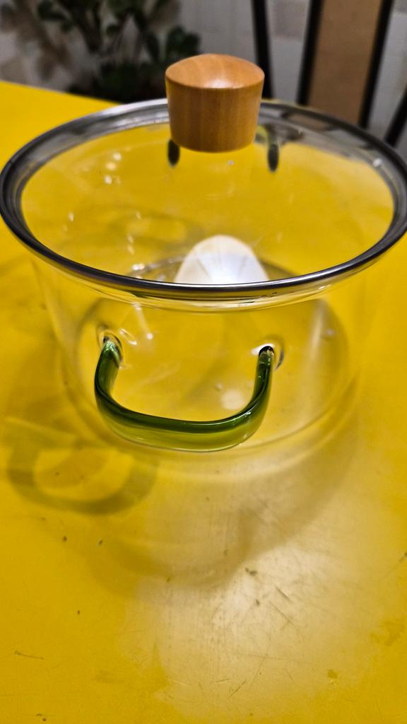 Cuteness! A very pretty item! A small pot with a capacity of up to 1.5 liters, transparent, with a lid... arrived undamaged. The packaging was, to be honest: "from the heart" - in a styrofoam box and two bags (one bulky, the other - bubble wrap). I tried cooking in it on an electric stove - it turns out even beautiful, especially when the water boils, you can get mesmerized by this process... I'm interested, can this little pot be used on an induction cooktop? What do people say, but there are no instructions...