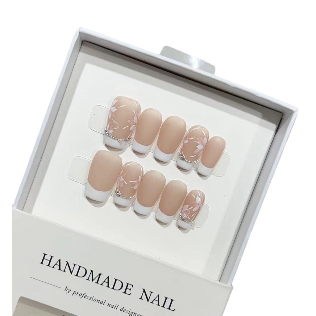 Autumn and Winter Style French Wearer High-end Nude Color Atmosphere Matte Nail Art Hand-painted Small Flower Steel Beads Broken Diamond Fake Nail