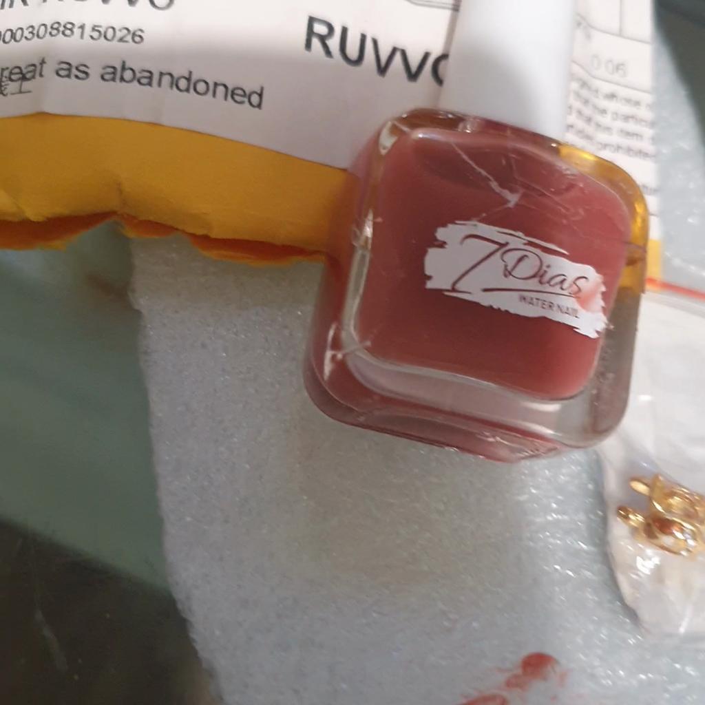 The bottle is cracked and the contents (varnish) are leaking out, apparently due to the decoration that was included as a gift, it's a great pity