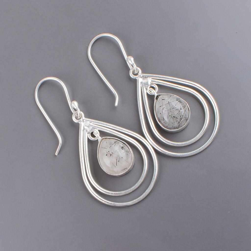 Natural Black Rutile Gemstone 925 Solid Silver Designer Jewelry Earrings 2.00" EE-34-25