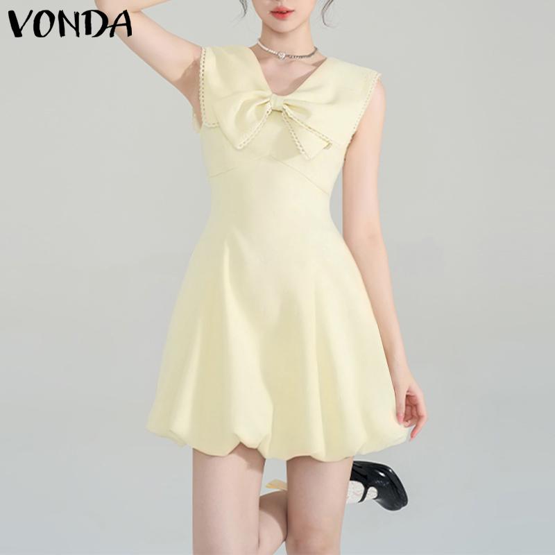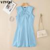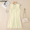 VONDA Women Sleeveless Dress Casual V Neck Bow Knot Crochet Hem Ruffled Mini Dresses