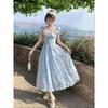 Women's Summer Sweet and Thin Skirt Blue Long Casual Girlish Print Xiaofei Sleeve Suspender Dress