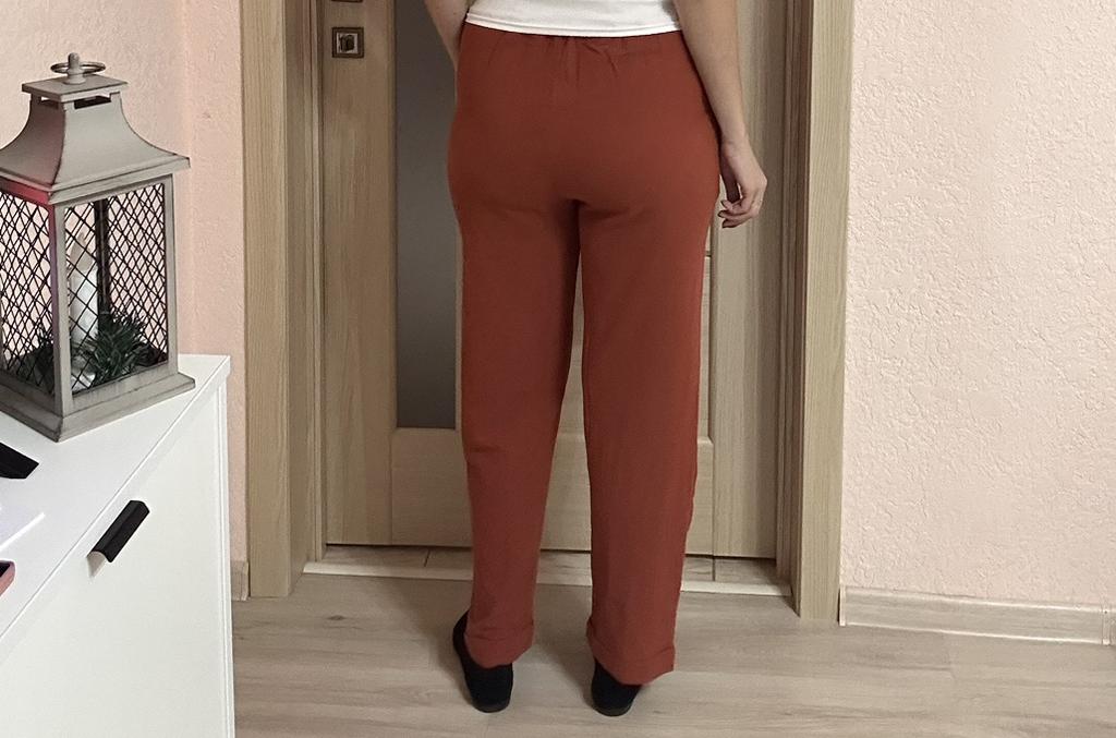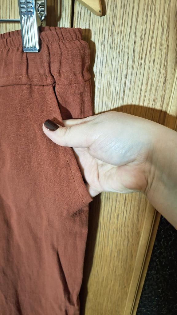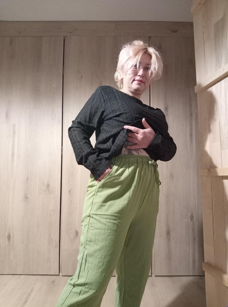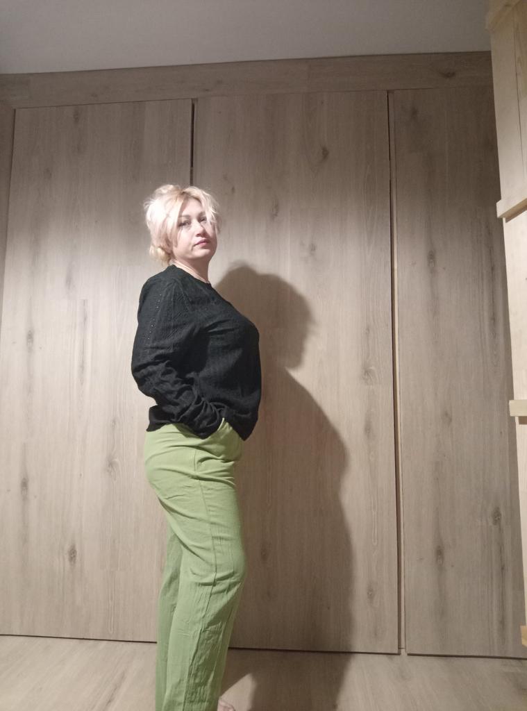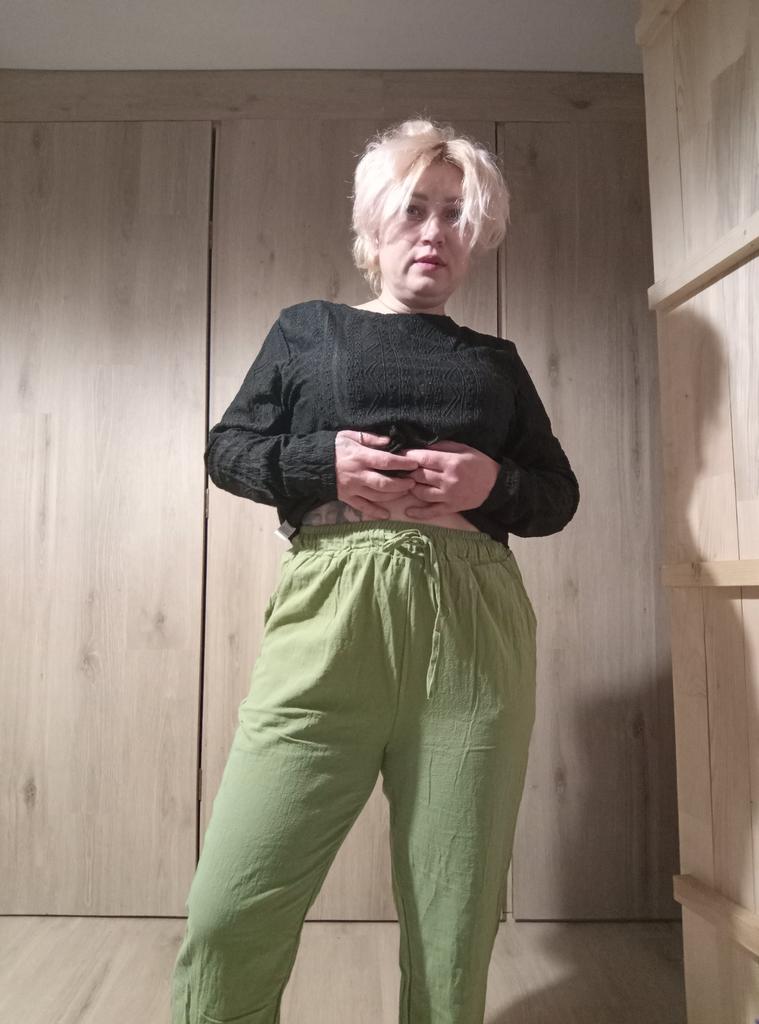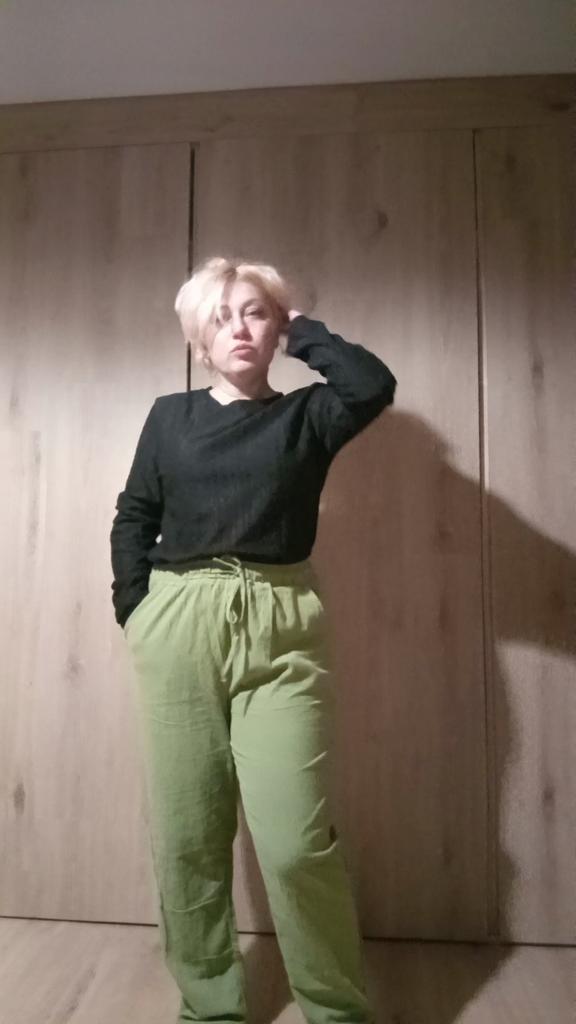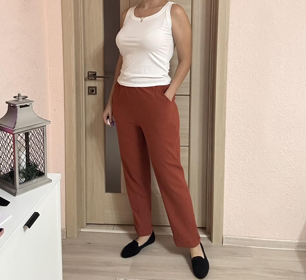Super pants for Saturday at home 😊 Breathable, lovely color, they have pockets 😍 For me, those pockets are key. They are also very high-waisted pants, so you don't have to adjust them, they stay up nicely. The elastic, however, is very strong. If you don't like tightness around the stomach, it's worth taking a size up. :)