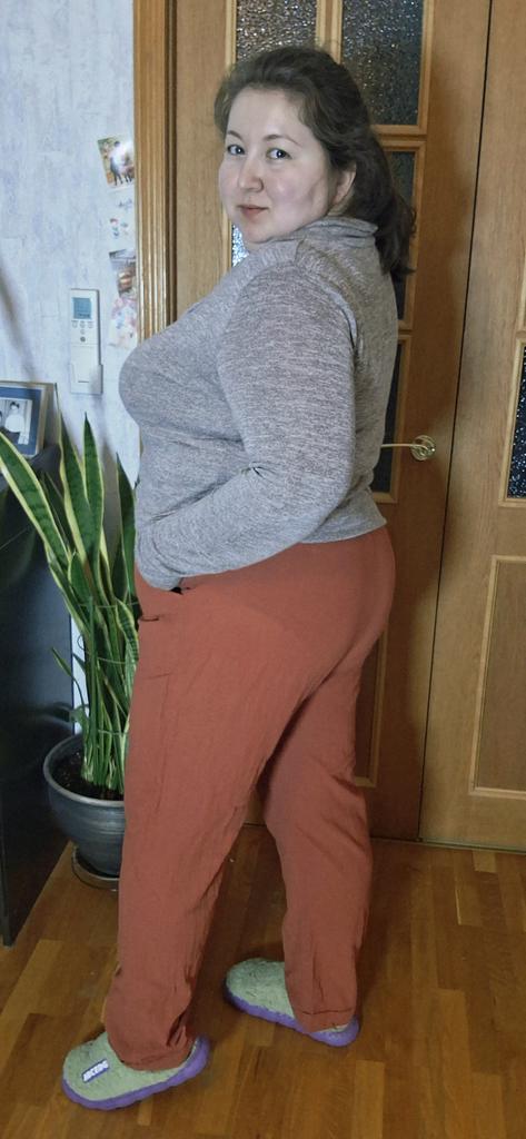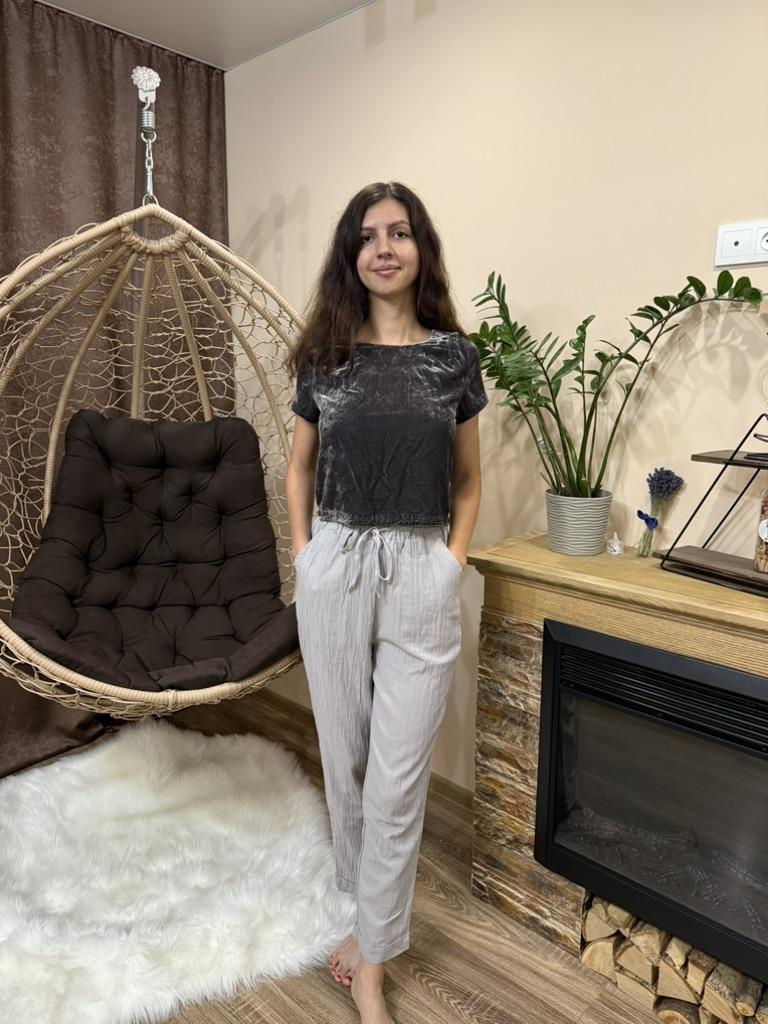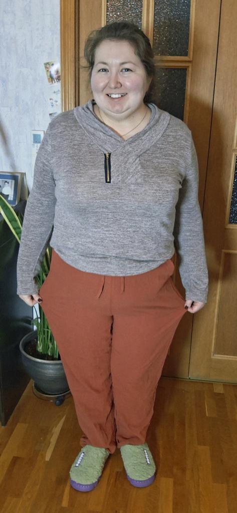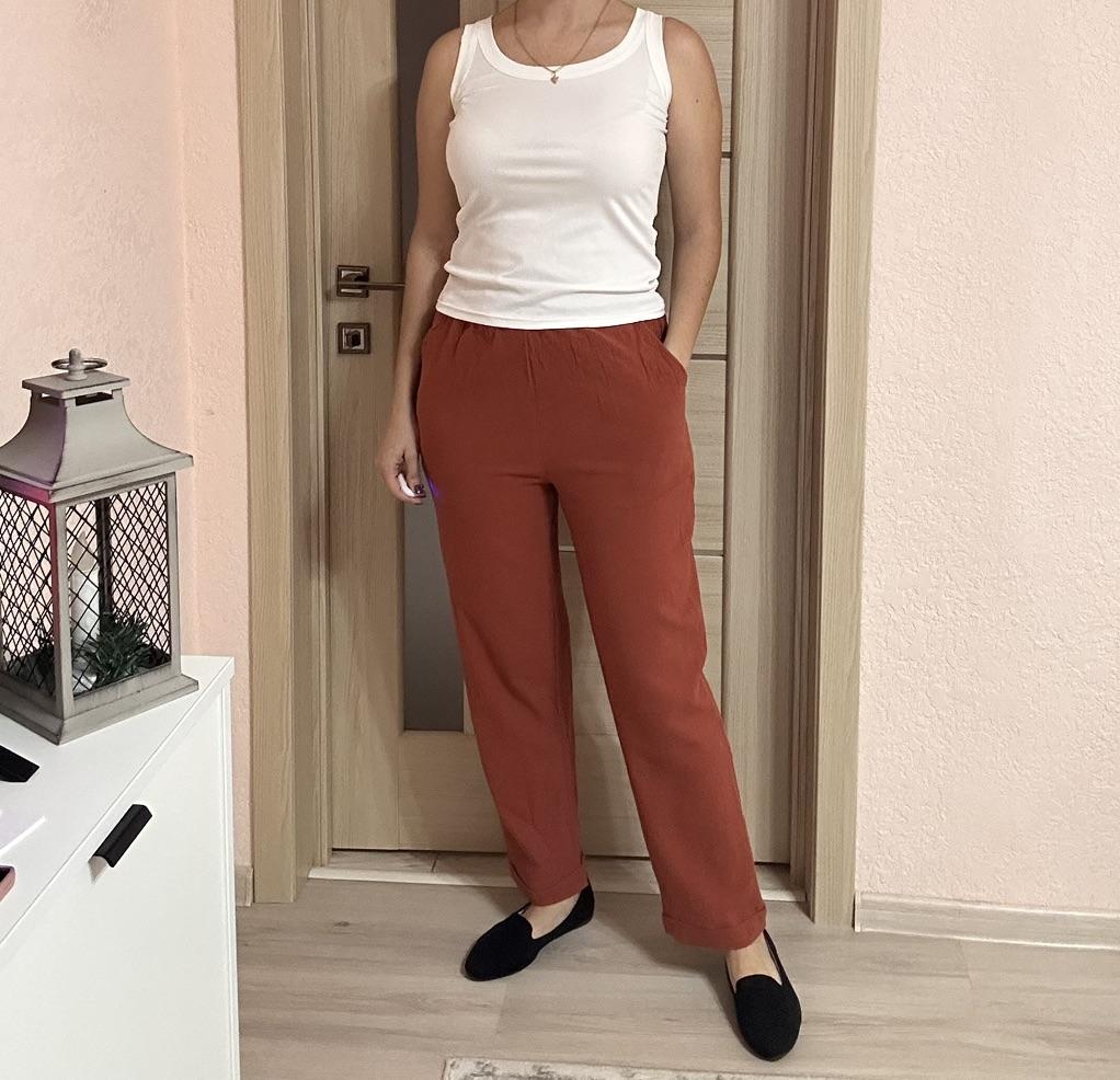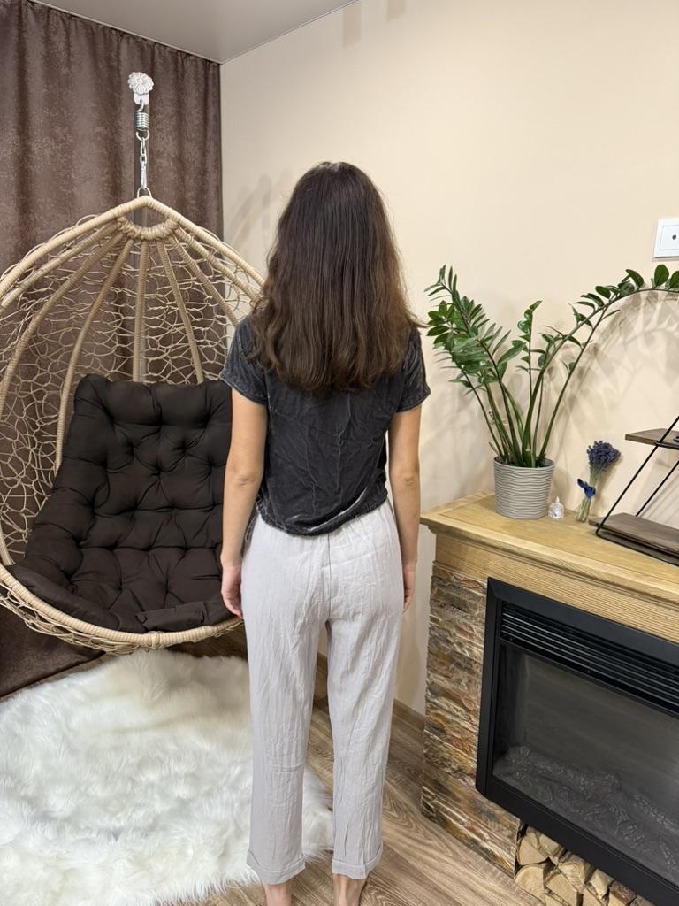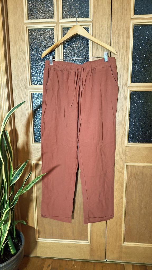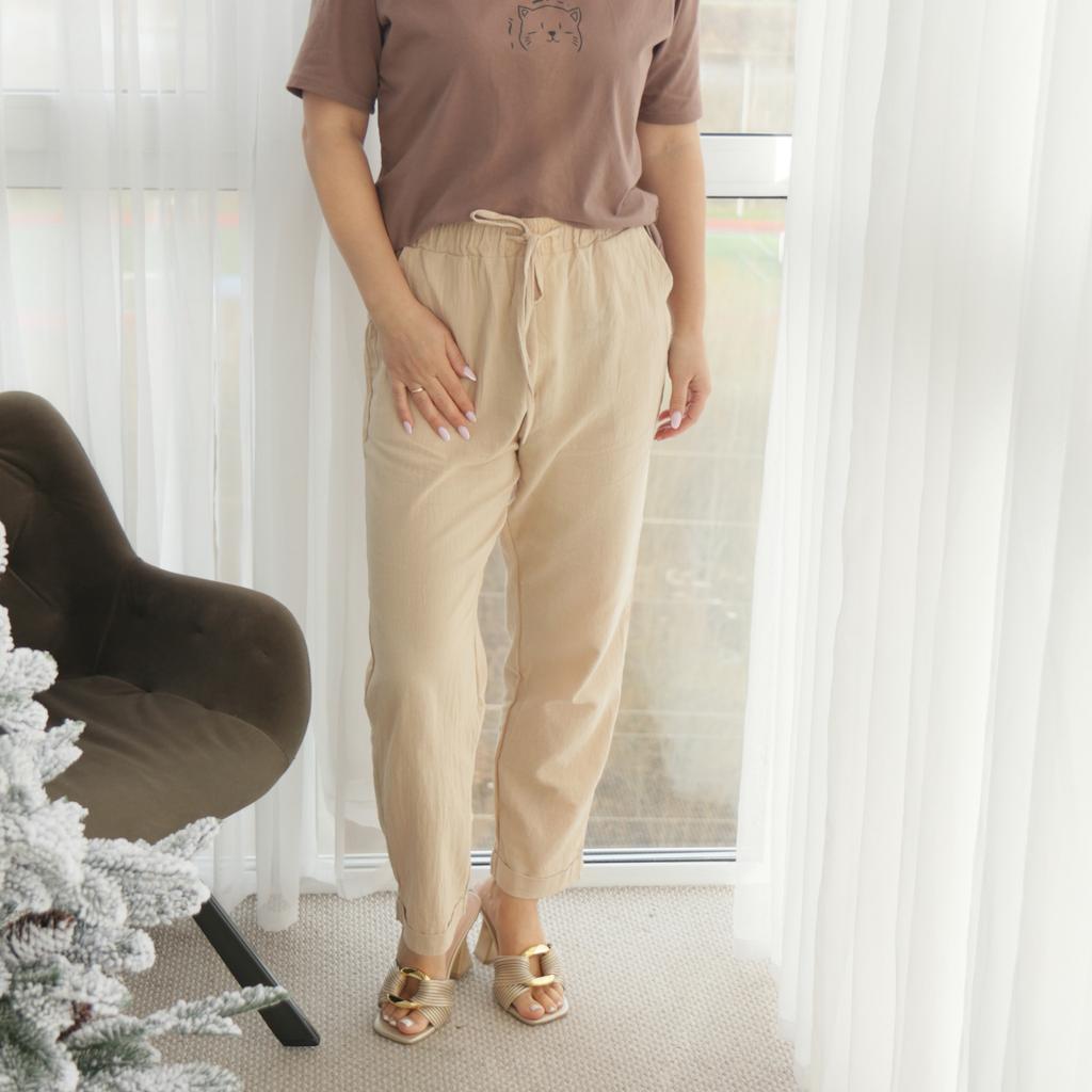 Super pants for Saturday at home 😊 Breathable, lovely color, they have pockets 😍 For me, those pockets are key. They are also very high-waisted pants, so you don't have to adjust them, they stay up nicely. The elastic, however, is very strong. If you don't like tightness around the stomach, it's worth taking a size up. :)