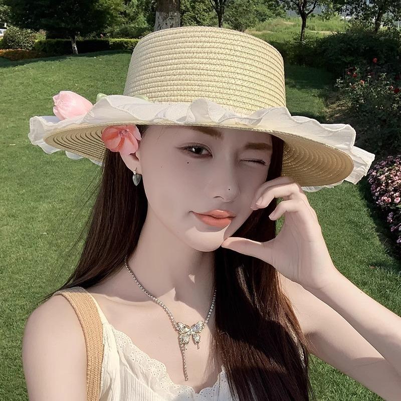 Lace Bow Tulip Straw Hat Women's Summer Seaside Beach Vacation Sun Hat Shade Sun Protection Hat
