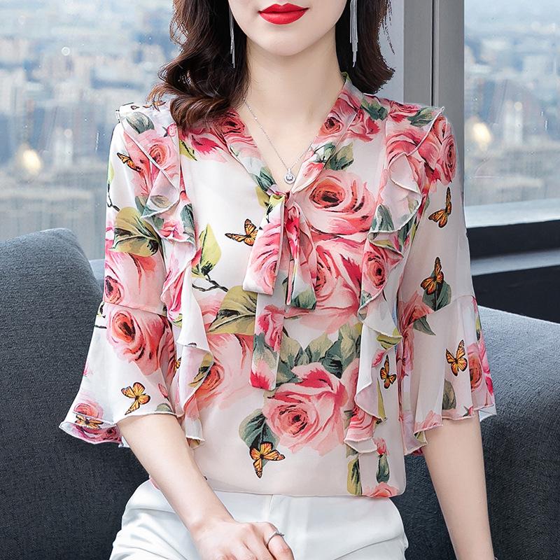 Elevate your wardrobe with this exquisite chiffon top designed for women seeking a slimming and youthful style. Crafted from high-quality chiffon, this top features a charming floral pattern that adds a touch of elegance to your look. The short sleeves and loose fit ensure comfort and easy movement, while the v-neckline enhances your natural beauty. Adorned with a tasteful print, this stylish piece is perfect for various occasions, combining sophistication with a sense of effortlessness.