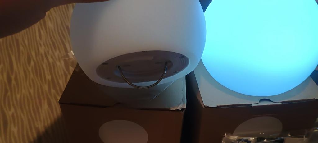 The item was delivered in 14 days. It was packed in a box. Ball-shaped night light, USB rechargeable. Many colors and modes, can be made brighter and dimmer, smooth color transition mode. Plastic. Has a ring for hanging if needed.