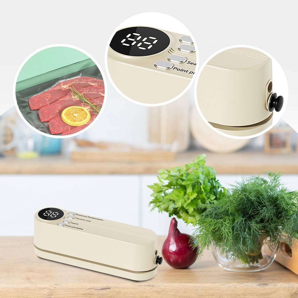 Multifunctional three modes to meet needs Vacuum sealing mode: one-touch start of intelligent vacuuming + sealing, suitable for meat, , dry goods and other ingredients that need long-term preservation; Single sealing mode: quickly seal potato chip bags, aluminum foil packaging, etc., and leak-proof; Manual point extraction mode: control the vacuuming time, suitable for soft or water-containing ingredients to avoid excessive compression. External vacuuming + inflation purpose With a special nozzle, vacuum fresh-keeping boxes and storage bags can be externally evacuated to extend the shelf life of ingredients; Comes with an inflation needle, compatible with inflation needs of sports balls, swimming rings, etc., one machine for multiple uses. Efficient performance and intelligent control Built-in 60kPa powerful power , quickly completes sealing in 10-20 seconds, and the fresh-keeping effect is more lasting; The digital LED screen clearly displays the mode and time, and the is and intuitive; Three-speed temperature control adjustment: according to the thickness of the packaging material (P1-P3), thin bags to thick bags can be tightly sealed. Wireless and portable, worry-free travel 1200mAh rechargeable lithium battery, fully charged in 2-5 hours, supports 40-60 times of continuous use; Lightweight body design, storage does not take up space, suitable for outdoor camping, travel, and home. Thoughtful accessories: Contains 4 food-grade sealing bags, ready to use . Includes: 1 sealing machine, 1 instruction manual, 1 charging cable, 1 small cutting board