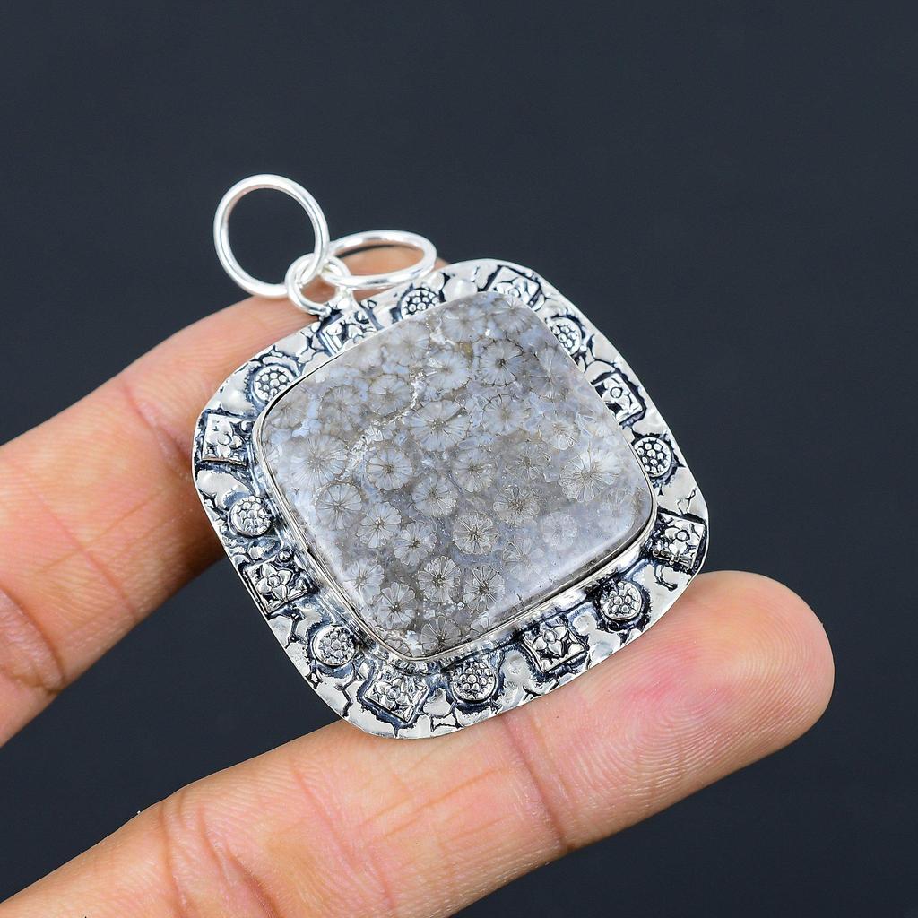 Cushion Fossil Coral Stone Sterling Silver Anniversary Wedding Pendant Jewelry