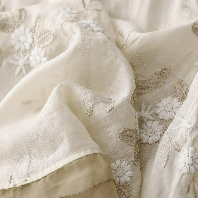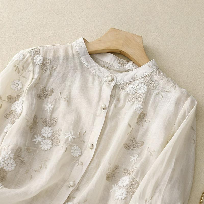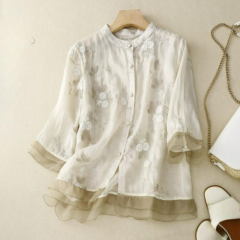 Heavy Industry Embroidered Ramie Blouse Women's Three-quarter Sleeve Cotton and Linen Stitching Small Shirt Women's Literary Retro