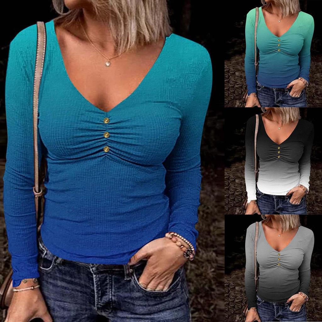 Fashion Womens Tops Casual V Neck Tunic Tops Striped Button Pullover Sweatshirt Casual T-shirt Top