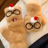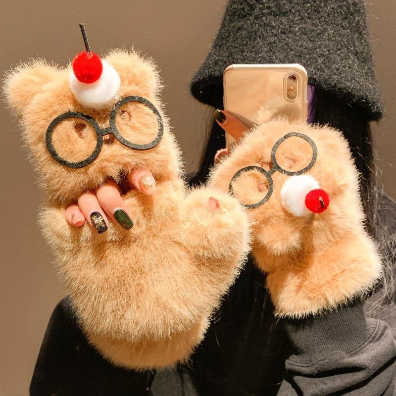 Cute Glasses Bear Plush Half Finger Flip Gloves Women's Winter Cartoon Versatile Can Be Cold, Windproof and Warm