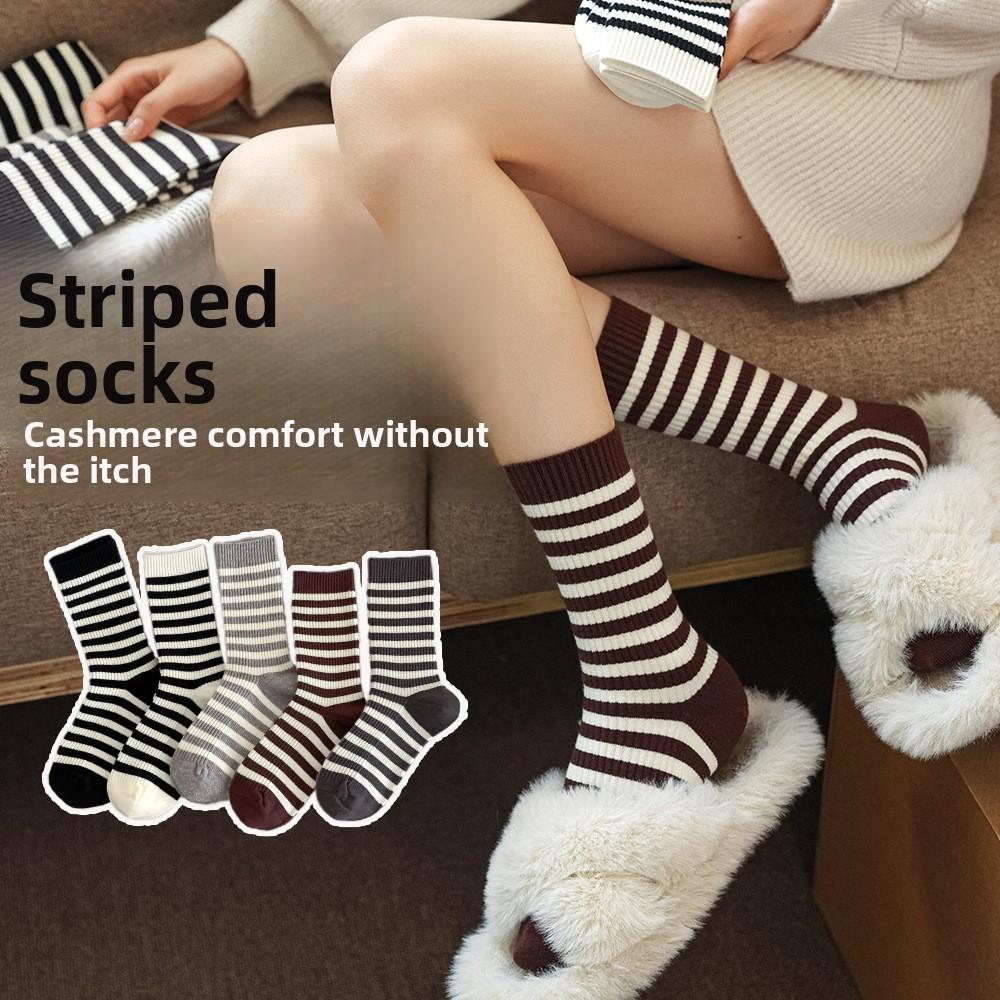 Striped Socks for Women, Thick and Warm Cashmere Socks for Autumn and Winter, Pile Socks, Mid-calf Socks, Versatile and Trendy Long Calf