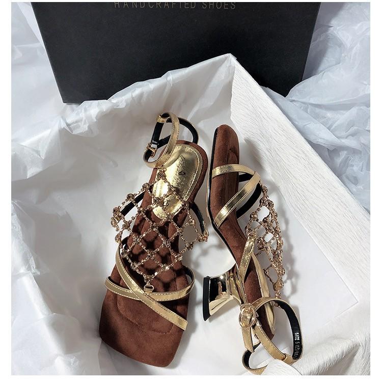 2025 New Rhinestone High Heel Square Head Thick Heel Internet Celebrity Temperament Metallic Commuter Open-toed Sandals