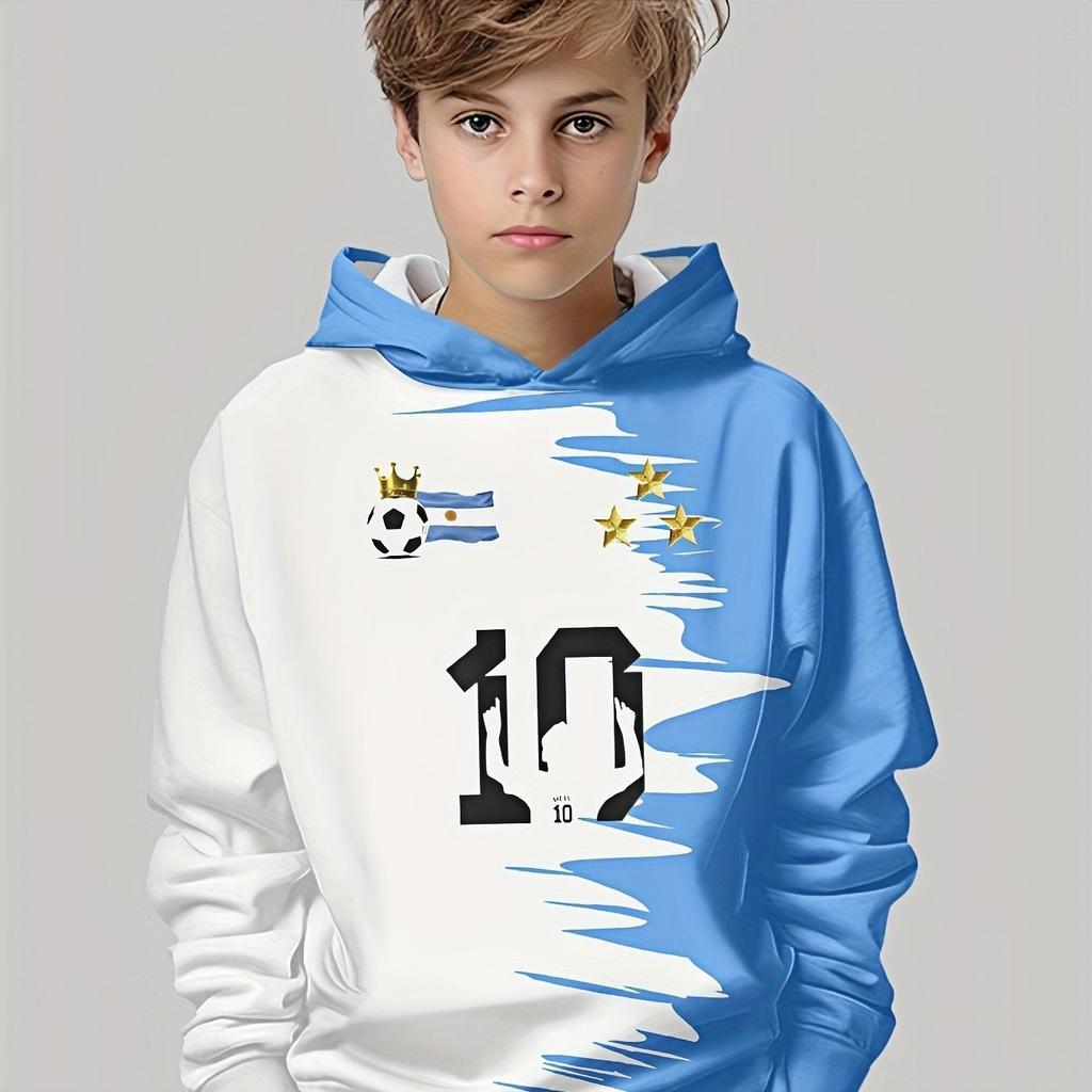 Boys' 3D Football Printed Hoodie - Casual Pullover, Blue and White Splash Design, Long Sleeves, Polyester Blend