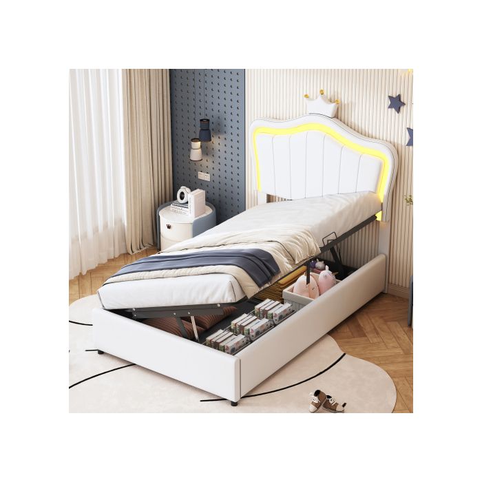 Lit D'enfant - MUVOE - 90x200 Cm - Similicuir Blanc - Éclairage LED - Rangement Hydraulique