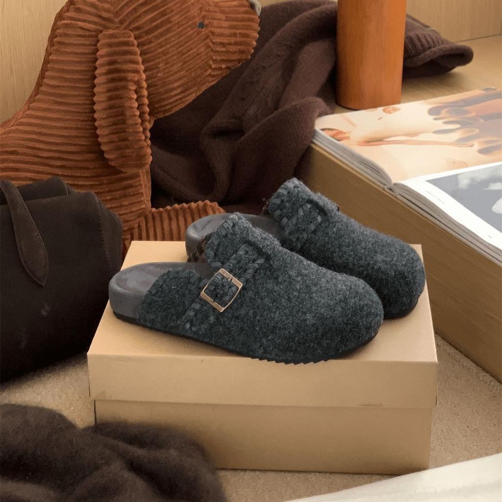 Cowhide Version~ Retro Evening Wind Bag Head Half Slippers Women Wear a Pedal On the Outside, Thick-soled Gray Woolen Boken Shoes Women