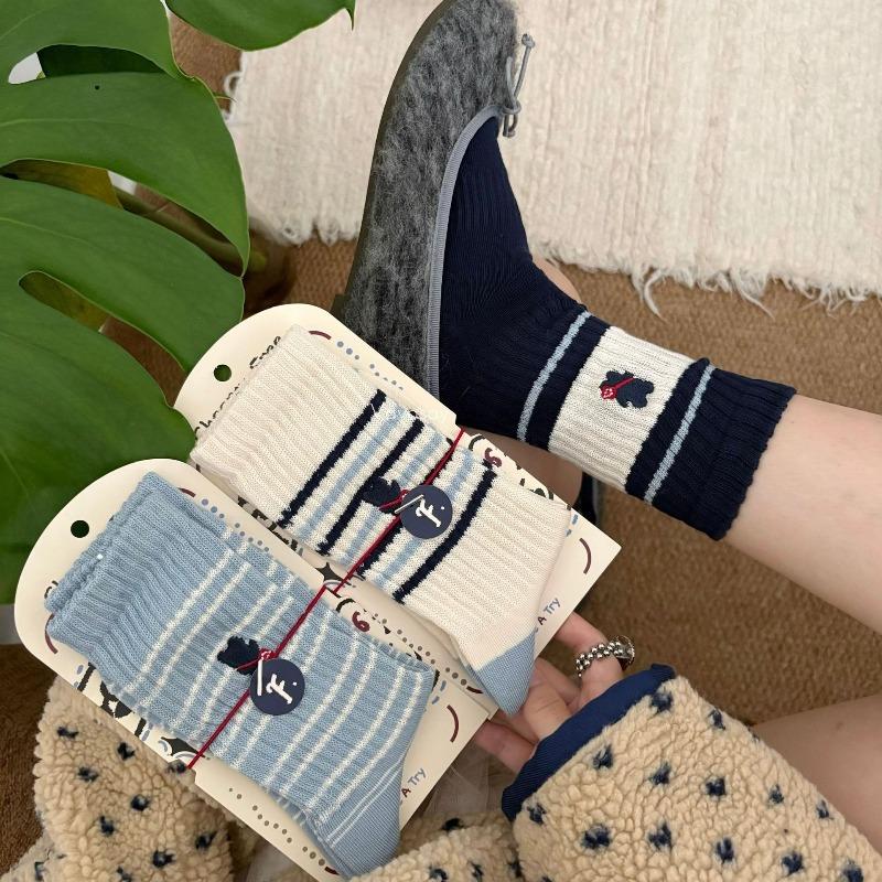 Backpack Bear Cub, Navy Blue Mid-calf Socks, Little Bear Cartoon School Style, Striped Embroidery, Pile Socks, Girl