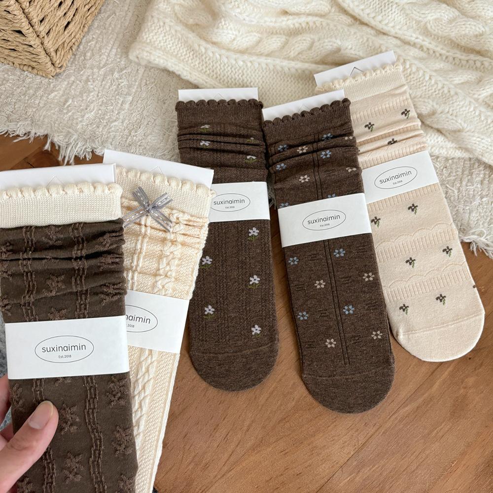 Women's Early Autumn Retro Mid-calf Socks with Lace and Small Floral Pile Socks