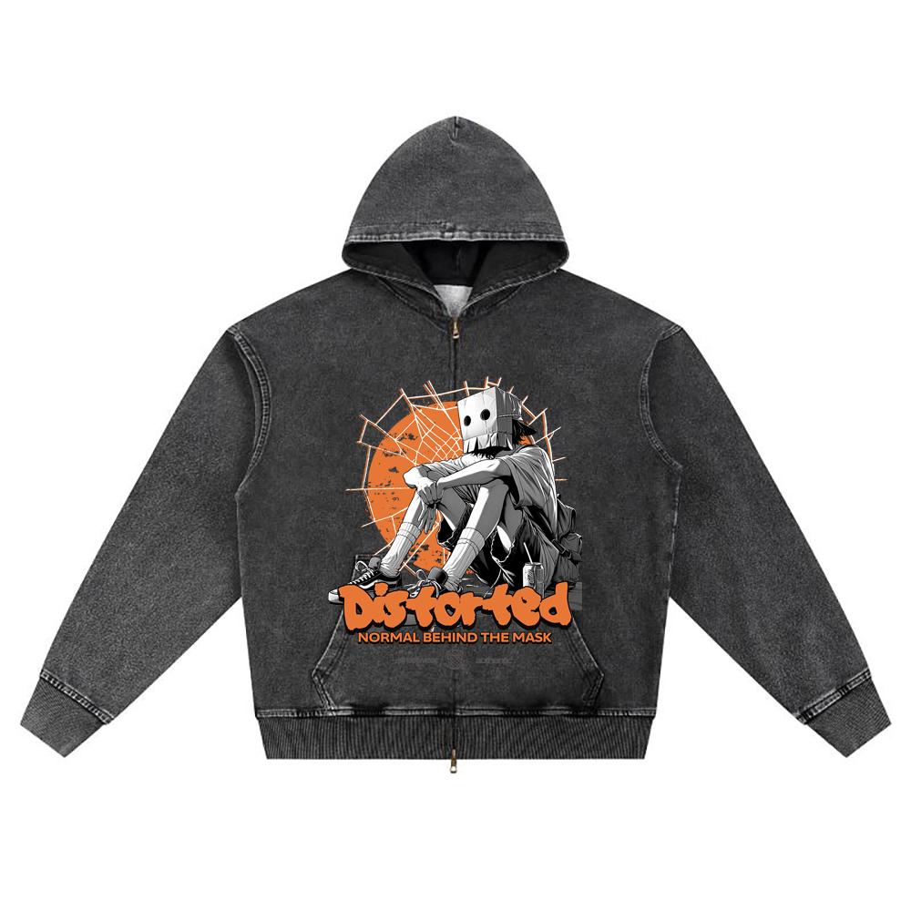 DTG Print Knitted Denim Zip-Up Hoodie Distorted Brother Print Zipper Hoodies