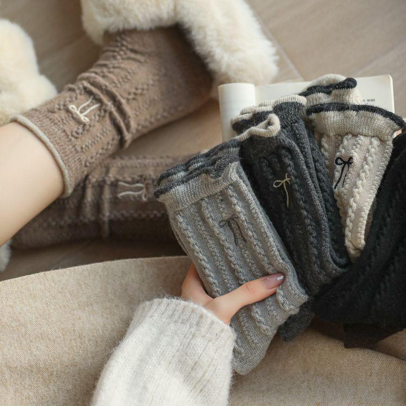 Women's Wool Socks: New Autumn & Winter Style, Lace Bow Embroidery, Fleece-Lined, Thick Knit, Warm Mid-Calf Socks