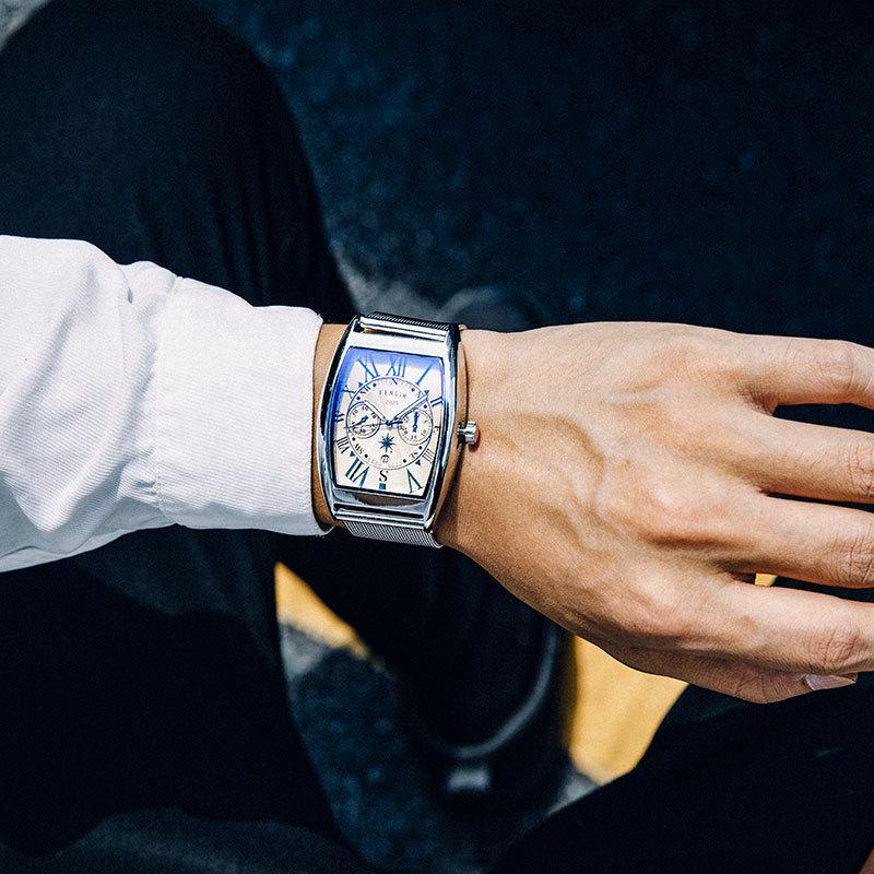 Finish Big Barrel Men's Watch: European & American Style, Leather Strap, Waterproof, Calendar, Casual Office Wear.