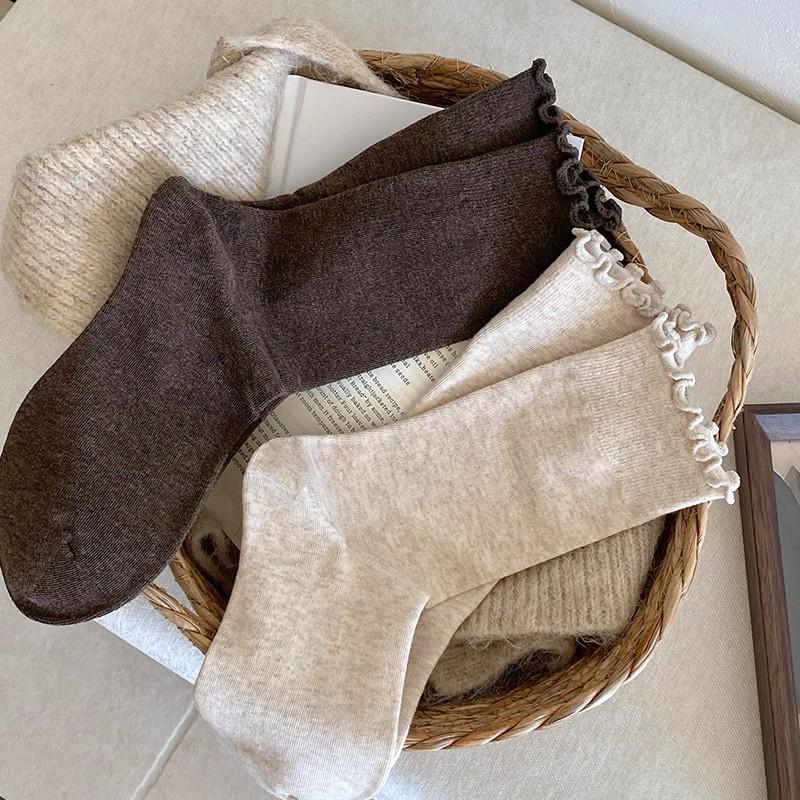 Women's Pure Cotton Ruffle Mid-Calf Socks, Soft Coffee Color, Breathable and Comfortable.